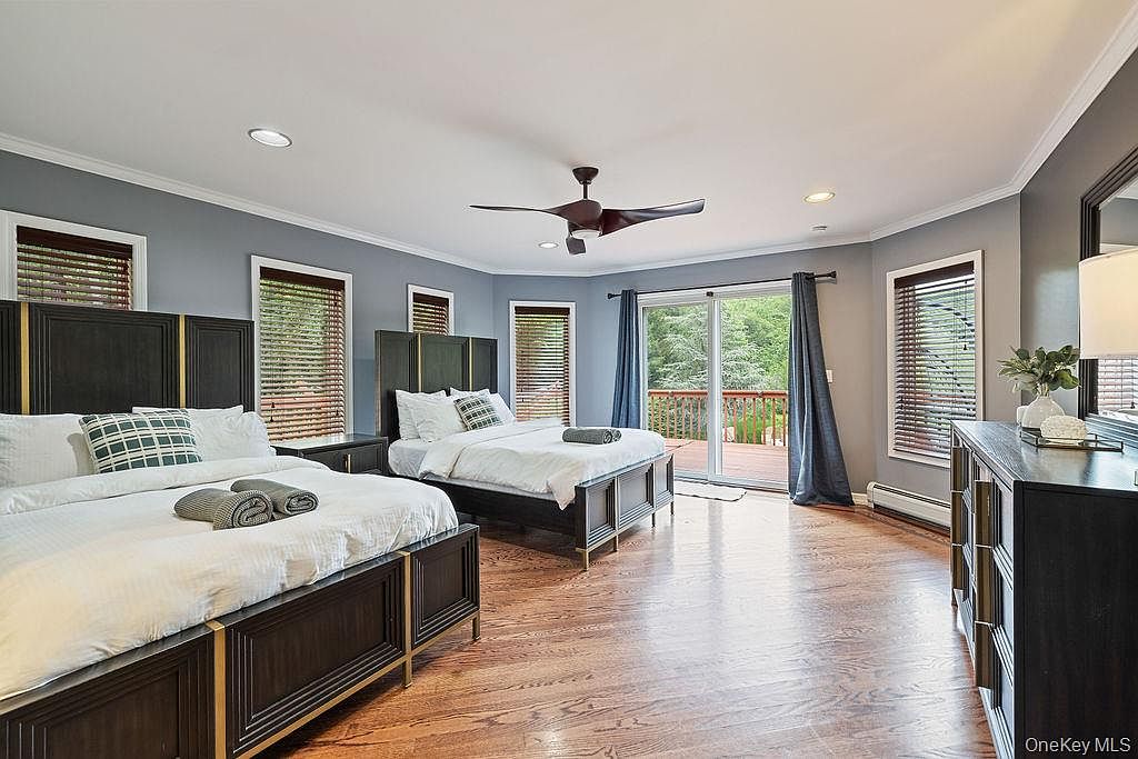 A large and welcoming guest bedroom features two queen-sized beds with elegant dark wood frames and matching nightstands, ideal for family stays or visiting friends. Soft gray walls are complemented by white trim and warm wooden flooring, adding a cozy and modern touch. Multiple windows with wooden blinds allow ample natural light, while a set of sliding glass doors open to a deck overlooking lush greenery, blending indoor comfort with outdoor views. The room is thoughtfully furnished with a contemporary ceiling fan, stylish dresser, and simple, tasteful décor, making it both functional and inviting for guests of all ages.