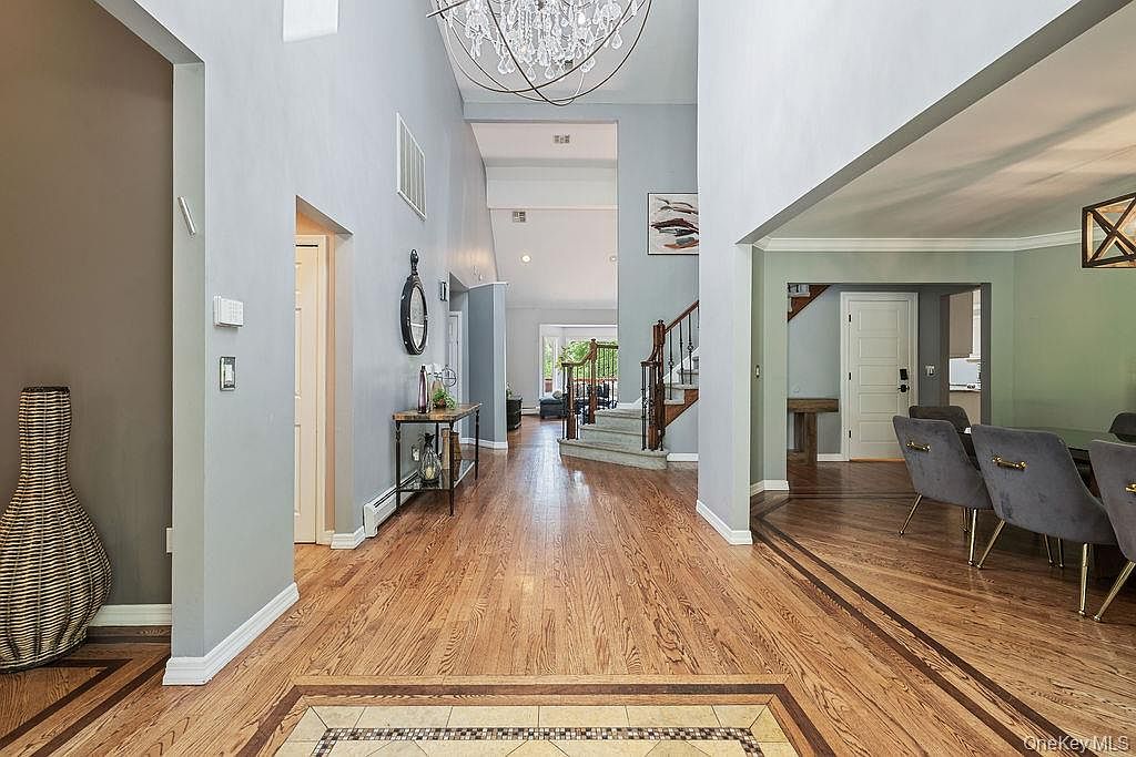 A spacious entryway welcomes you with soaring ceilings, a stunning chandelier, and elegant, light gray walls that create a calm, inviting atmosphere. The rich wood floors feature inlaid mosaic accents, adding a custom touch and seamlessly guiding you toward an open living area. A sleek console table with decor and a round wall mirror lend a personal, stylish note, while the open sightlines reveal a cozy family zone beyond. Off to the right, a modern dining area with plush gray chairs offers a perfect family gathering space. The overall design balances sophistication with family-friendly comfort and functionality.