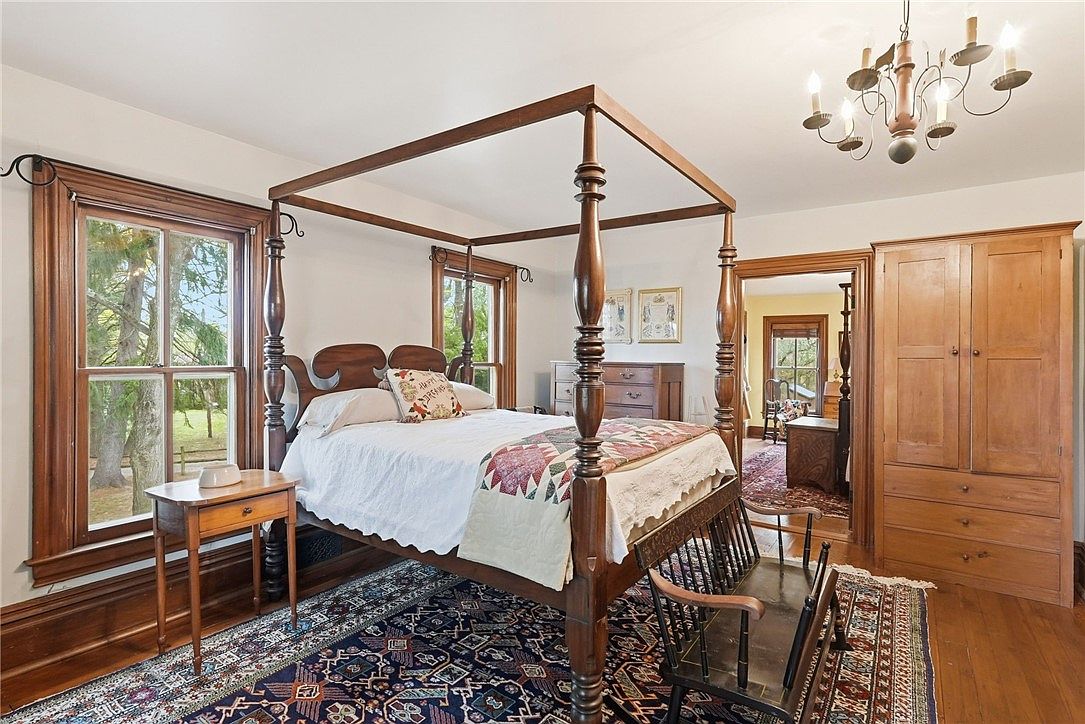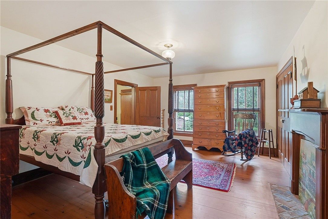 This spacious primary bedroom features a classic four-poster bed adorned with a hand-stitched quilt, evoking a sense of cozy Americana. Natural wood flooring and trim establish warmth, while large windows usher in abundant daylight and views of the greenery outside. The room is decorated with traditional wooden furnishings, including a tall chest of drawers and a timeless fireplace, creating an inviting space for relaxation. Thoughtful details like a wooden bench at the foot of the bed and a pair of rocking chairs make the room family-friendly, perfect for evening storytimes or quiet moments together.