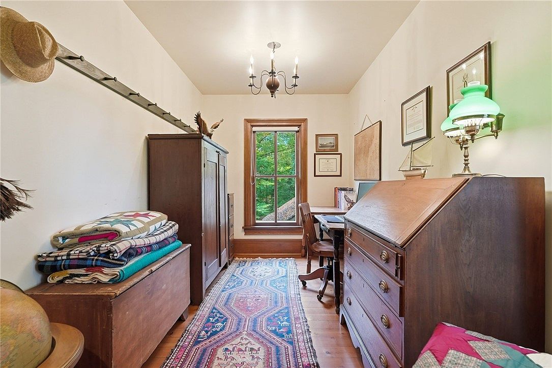 A charming, sunlit home office nook radiates warmth and character, featuring antique wooden furniture with a well-loved patina. A beautiful vintage desk creates a functional workspace beneath framed certificates and a classic green banker’s lamp, while a tall cabinet and chest provide ample storage for household essentials and cozy quilts. Neutral cream walls and medium-toned wood trim are balanced by a lively patterned rug that adds color and comfort underfoot. Arranged for both productivity and relaxation, this room’s window frames lush greenery outside, making it an inviting spot for family members of all ages to read, study, or pursue hobbies.