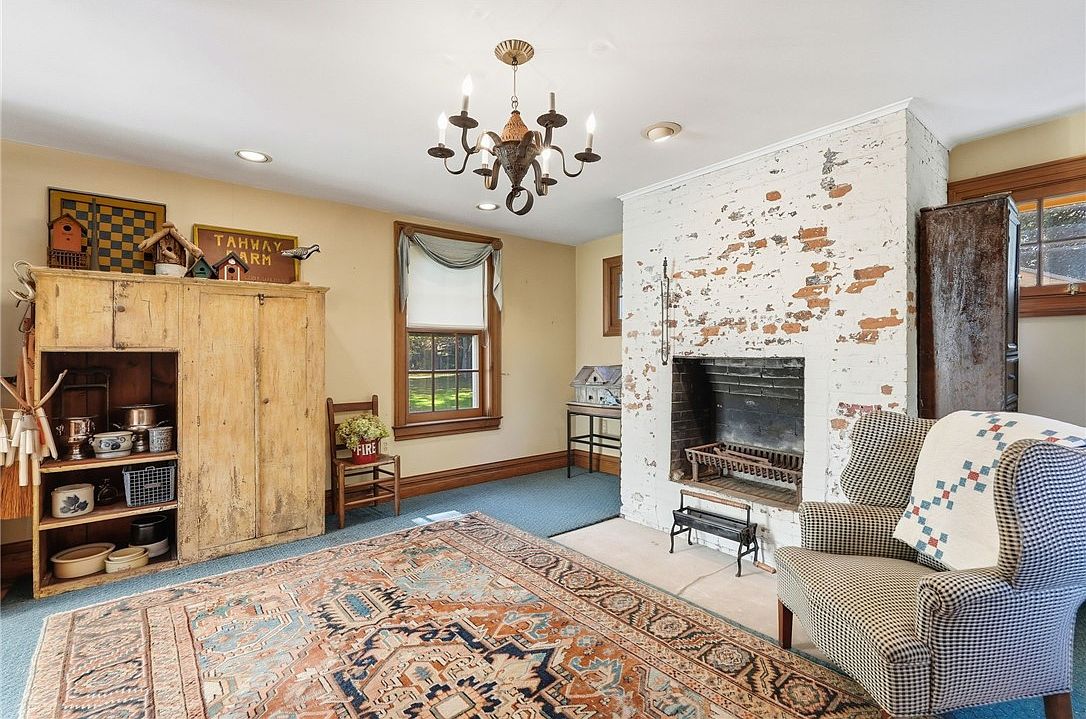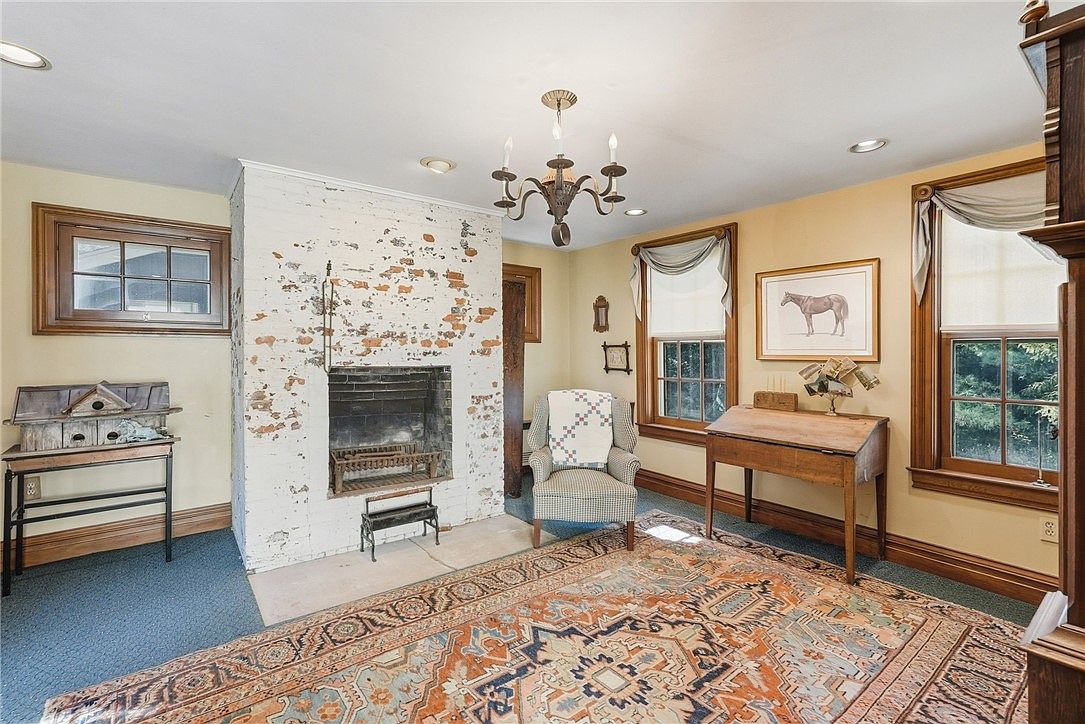 A cozy, character-filled sitting area features a striking whitewashed brick fireplace as its focal point, radiating rustic charm. The space is anchored by a vibrant patterned area rug, providing warmth underfoot and encouraging family gatherings. A comfortable armchair with a charming patchwork quilt sits beside a pair of generously sized, wood-trimmed windows that bathe the room in natural light. Soft beige walls complement the wooden accents, while a simple antique desk and farmhouse-inspired decor enhance the welcoming, homely environment. This blend of historic elements and family-friendly furnishings creates an inviting nook perfect for relaxing or sharing stories by the fire.