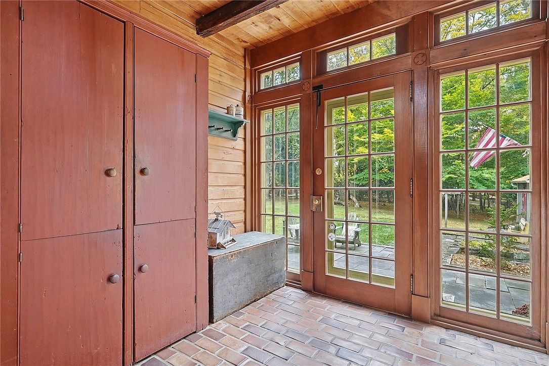 Warm natural light streams through large glass-paneled doors, connecting the mudroom to a lush backyard. The space features rustic red built-in cabinets for ample storage and a vintage-style chest ideal for shoes or sports gear. Brick flooring is durable and easy to clean, perfect for busy families and daily foot traffic. The wood-paneled walls and ceiling, highlighted by exposed beams, add an inviting, cabin-inspired charm. A simple wall shelf holds decorative accents, maintaining an uncluttered look. The overall earthy palette promotes a cozy, welcoming atmosphere, ideal for keeping outerwear organized and managing family comings and goings.