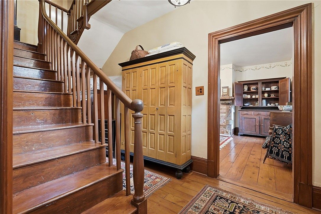 Warm wood tones dominate this inviting stairway foyer, where rich hardwood floors, staircase, and trim set a cozy, timeless atmosphere. An eye-catching mustard-colored armoire provides ample storage for families and echoes the traditional Americana charm. Area rugs soften the floors and add an extra layer of comfort for children and guests. Through a wide doorway framed in natural wood, a peek into the adjoining room reveals classic cabinetry and a patterned throw, reinforcing the home’s welcoming, lived-in feel. Cream-colored walls and high ceilings brighten the space while maintaining a practical, family-friendly layout guiding traffic easily between rooms.