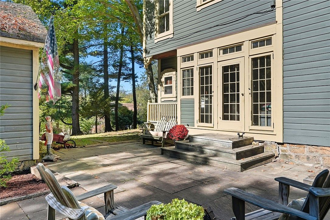 A charming backyard patio space nestled beneath mature trees, perfect for family gatherings or quiet relaxation. French doors with divided lights open from the home to the stone-tiled patio, inviting a seamless indoor-outdoor flow. Soft blue-gray and cream trim on the house complements the earthy tones of the stonework. Comfortable Adirondack-style chairs and a welcoming wooden bench provide ample seating for all ages. The area is enhanced by seasonal flowers and playful garden statuary, creating a cozy atmosphere. This family-friendly retreat offers a safe open area for kids to play and adults to unwind amid nature.