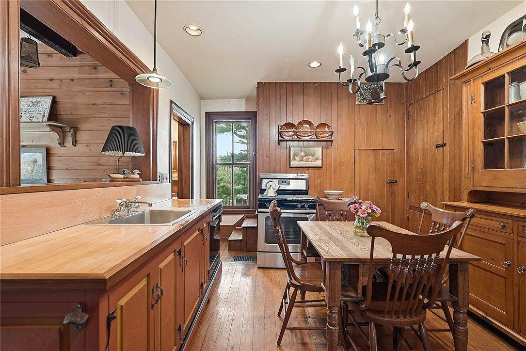 Warm wood paneling and cabinetry set a cozy, rustic tone in this family-friendly kitchen nook. The open layout features a charming dining table at the center, surrounded by classic wooden chairs perfect for shared meals or homework sessions. Natural light floods the space through large windows, highlighting the earthy brown and tan color palette. Accents like a country-style chandelier, display shelves with decorative plates, and framed vintage artwork bring personalized touches. The adjacent kitchen sink, countertop, and modern range blend seamlessly with traditional elements, ensuring a space that combines functionality and welcoming ambiance for gatherings and daily life.