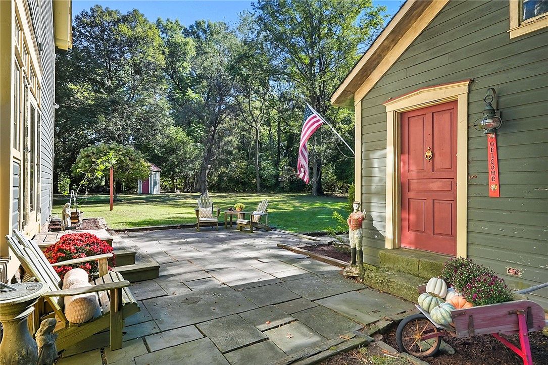 A charming stone patio bridges the space between the house and a quaint outbuilding, enhanced by warm red accents on doors and autumn-themed decor. Adirondack chairs and small tables invite gatherings or quiet moments, while family-friendly features like easy seating and a wide open lawn provide ample play space for children. Potted flowers, a festive wheelbarrow filled with pumpkins, and thoughtful statues add homely touches. The backdrop of mature trees creates privacy and shade, while the American flag lends a welcoming, patriotic flair. Natural wood and muted green siding offer a classic, timeless appeal perfect for family living and entertaining.