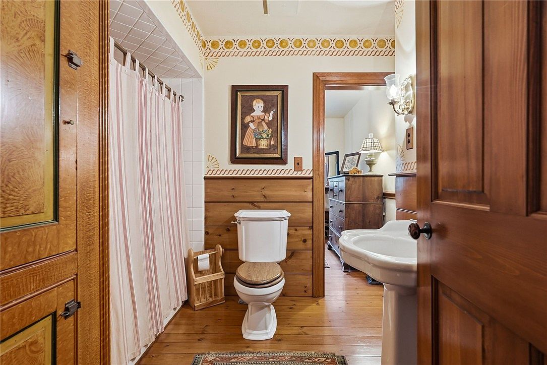 A cozy bathroom designed with warm wood tones and charming rustic details, featuring a tiled shower with a striped curtain, classic white porcelain fixtures, and a hardwood floor that extends throughout the space. The walls are adorned with a playful yellow patterned border and natural wood wainscoting, adding both texture and a family-friendly touch. Artful accents like a vintage-inspired painting and soft lighting from a wall sconce create a welcoming atmosphere. An open doorway leads to a similarly styled hallway, ensuring an easy flow for family members, while the storage solutions keep essentials tidy and accessible.