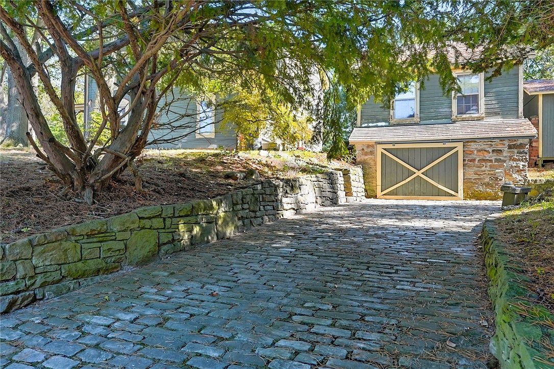 A charming stone driveway leads up to a traditional American home, flanked by rustic stone retaining walls and mature trees providing dappled shade. The pathway’s cobblestone texture adds timeless character and durability, perfect for family use and outdoor play alike. At the driveway’s end, a classic carriage-style garage door and stone foundation evoke farmhouse aesthetics, harmonizing with the green clapboard exterior. Soft green and earthy brown hues blend seamlessly with the natural landscape, creating a welcoming, relaxed approach. Generous space between the stone planters and driveway ensures both safety and accessible parking for family gatherings.
