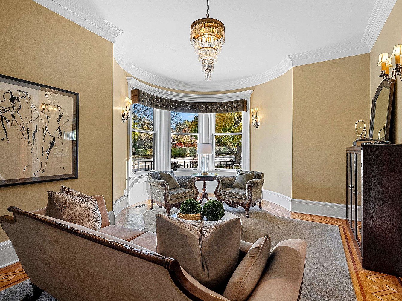A sun-drenched sitting room with elegant bay windows offering abundant natural light and picturesque views of the outdoors, making it a relaxing retreat for family or guests. The decor showcases soft beige walls, intricate crown molding, and warm-toned wooden flooring with a decorative border, adding timeless charm. A classic upholstered sofa and a pair of armchairs form an inviting conversation area around a small round table, perfect for games or afternoon tea. Subtle modern art, a statement chandelier, and ornate wall sconces blend classic and contemporary styles for a balanced and welcoming family-friendly space.