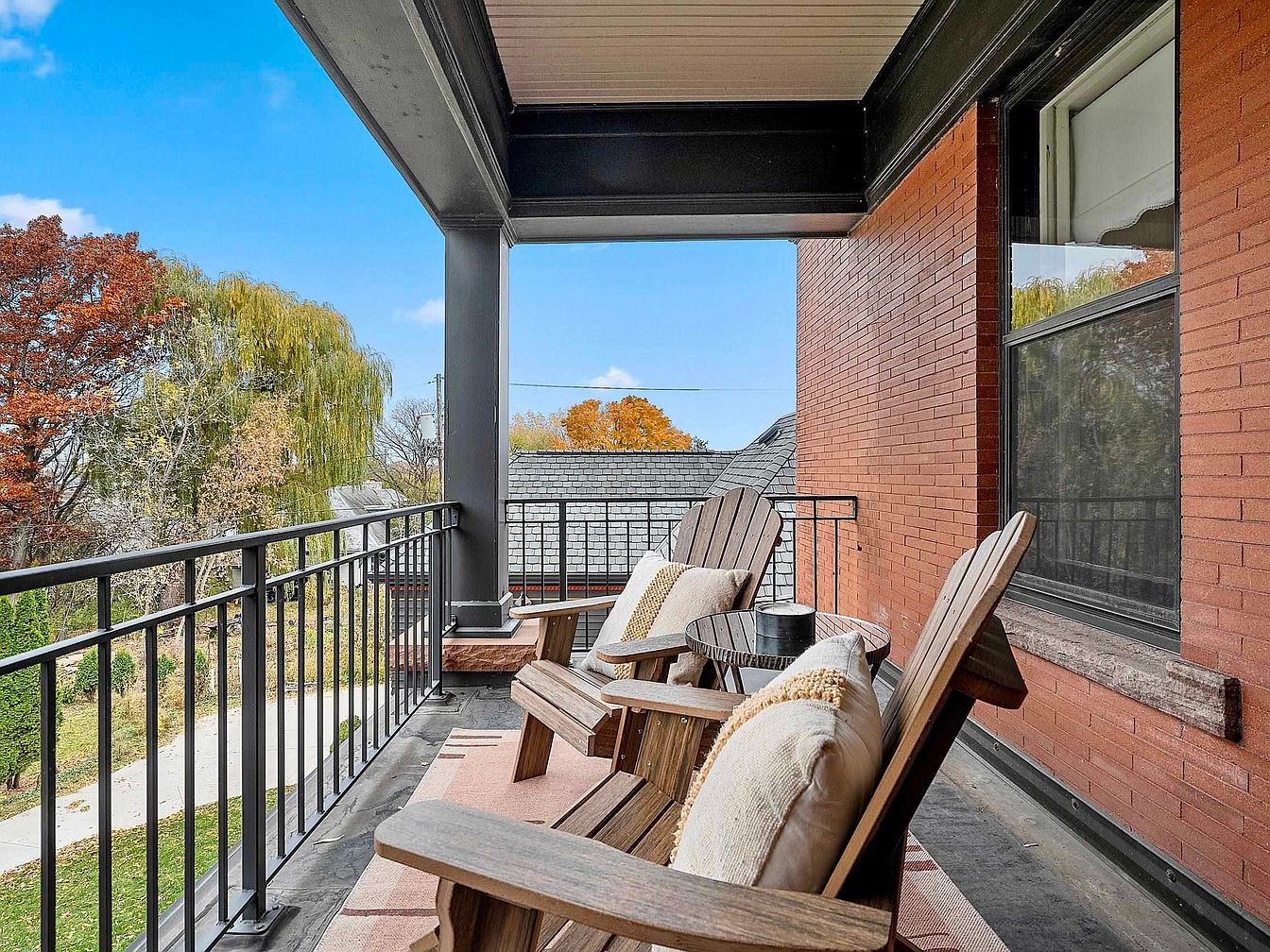A spacious and inviting front porch offers the perfect blend of relaxation and family-friendly comfort. Featuring classic wooden Adirondack chairs with plush, neutral-toned cushions and a central side table, the area is designed for casual gatherings or peaceful mornings. The brick exterior and solid black railing add a touch of traditional charm, while the overhead cover ensures shade and protection. The porch overlooks a tree-filled yard, making it a serene spot for adults to unwind or children to watch passing neighbors. This space beautifully balances natural textures and cozy details, adding warmth and style to the home’s entrance.