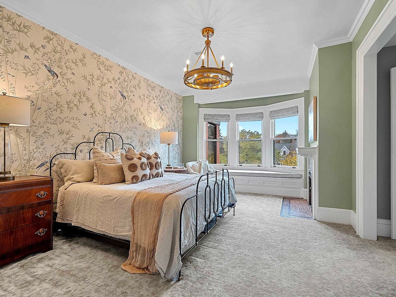 Spacious and inviting, this master bedroom offers a sanctuary for rest and family relaxation. The soft sage green walls harmonize with the nature-inspired wallpaper, featuring delicate foliage and birds, creating a calm atmosphere. Large bay windows allow natural light to flood the room and offer a charming built-in bench, perfect for reading or enjoying the view. The centerpiece is a plush bed with an elegant wrought iron frame and an array of cozy pillows. Classic furniture in rich wood tones and a gold chandelier add sophisticated touches, while plush carpeting ensures comfort for everyone, making it ideal for family moments.