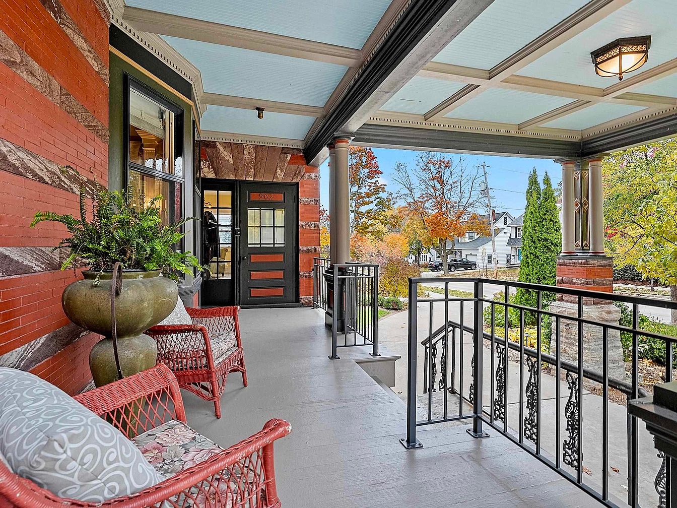 This grand front porch blends timeless architectural beauty with a welcoming, family-friendly atmosphere. Sturdy decorative columns and classic iron railings frame the spacious area, while a gentle ceiling painted in soft blue-green adds character and the illusion of height. The brick exterior and subtle painted accents provide a warm contrast to the lush greenery and tree-lined street views. Comfortable wicker seating with plush pillows invites relaxation, making it ideal for children to play while adults unwind or socialize. The open yet secure layout encourages outdoor living, offering an inviting entry point for guests and a cozy spot for family gatherings.