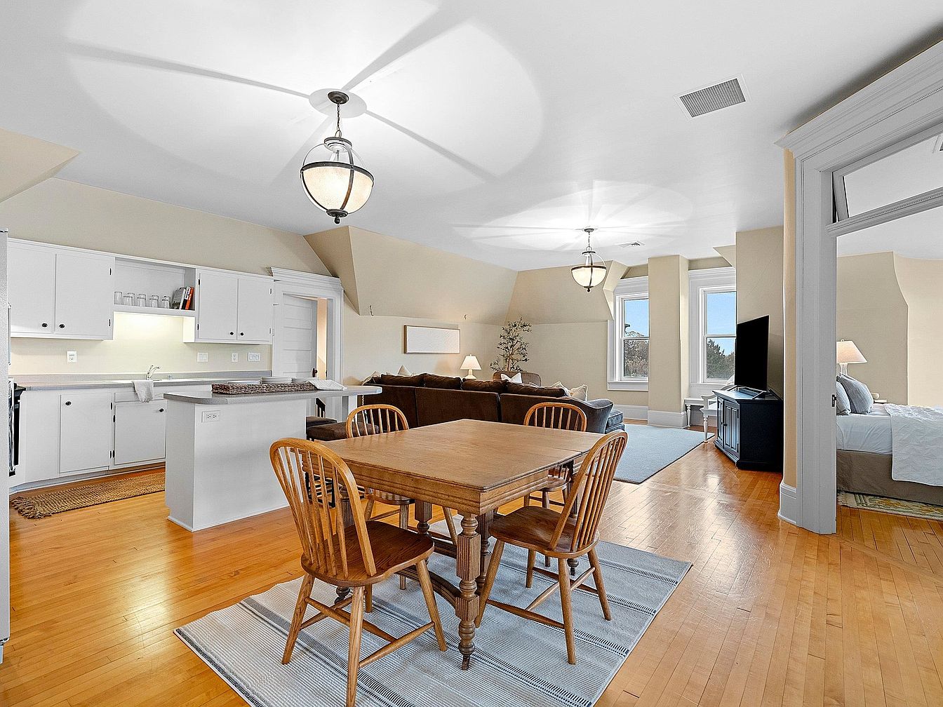 An inviting open-concept living and dining space seamlessly blends comfort and functionality, perfect for family gatherings or entertaining friends. Warm wood floors and soft beige walls create a welcoming atmosphere, while natural light pours in through large windows. The kitchen, featuring crisp white cabinetry and a peninsula, flows easily into the dining area, where a sturdy wooden table offers space for shared meals. The adjoining living room boasts a cozy sectional sofa and is set up for relaxing evenings by the TV. The space is family-friendly, with clear sightlines and practical furnishings, promoting togetherness and ease of movement.