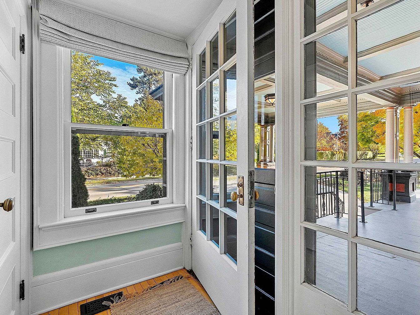 Bright and welcoming, the front entryway seamlessly blends indoor comfort with outdoor charm. A glass-paneled door framed by tall sidelights allows natural light to pour in, illuminating the airy space. Soft mint-green walls beneath crisp white trim create a refreshing and cheerful feel, while warm hardwood flooring and a textured area rug add a cozy, family-friendly touch. The adjacent porch, visible through the expansive windows, features detailed columns and wrought-iron railings, inviting gatherings or quiet moments outside. Easy transitions between indoors and outdoors make this area ideal for families, providing both functionality and an inviting aesthetic.