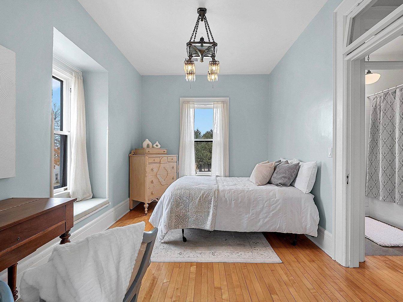 A serene and spacious bedroom designed with pale blue walls and crisp white trim for a calming atmosphere. Natural light floods the room through classic double-hung windows adorned with soft, sheer curtains, offering both privacy and warmth. The hardwood floor adds a touch of warmth and durability, making it ideal for family living. The arrangement includes a cozy bed dressed in neutral bedding and inviting pillows, a beautiful antique-style dresser, and a small writing desk perfect for homework or creative projects. The attached bathroom is easily accessible, enhancing convenience for families and creating a comfortable, practical space for everyday use.