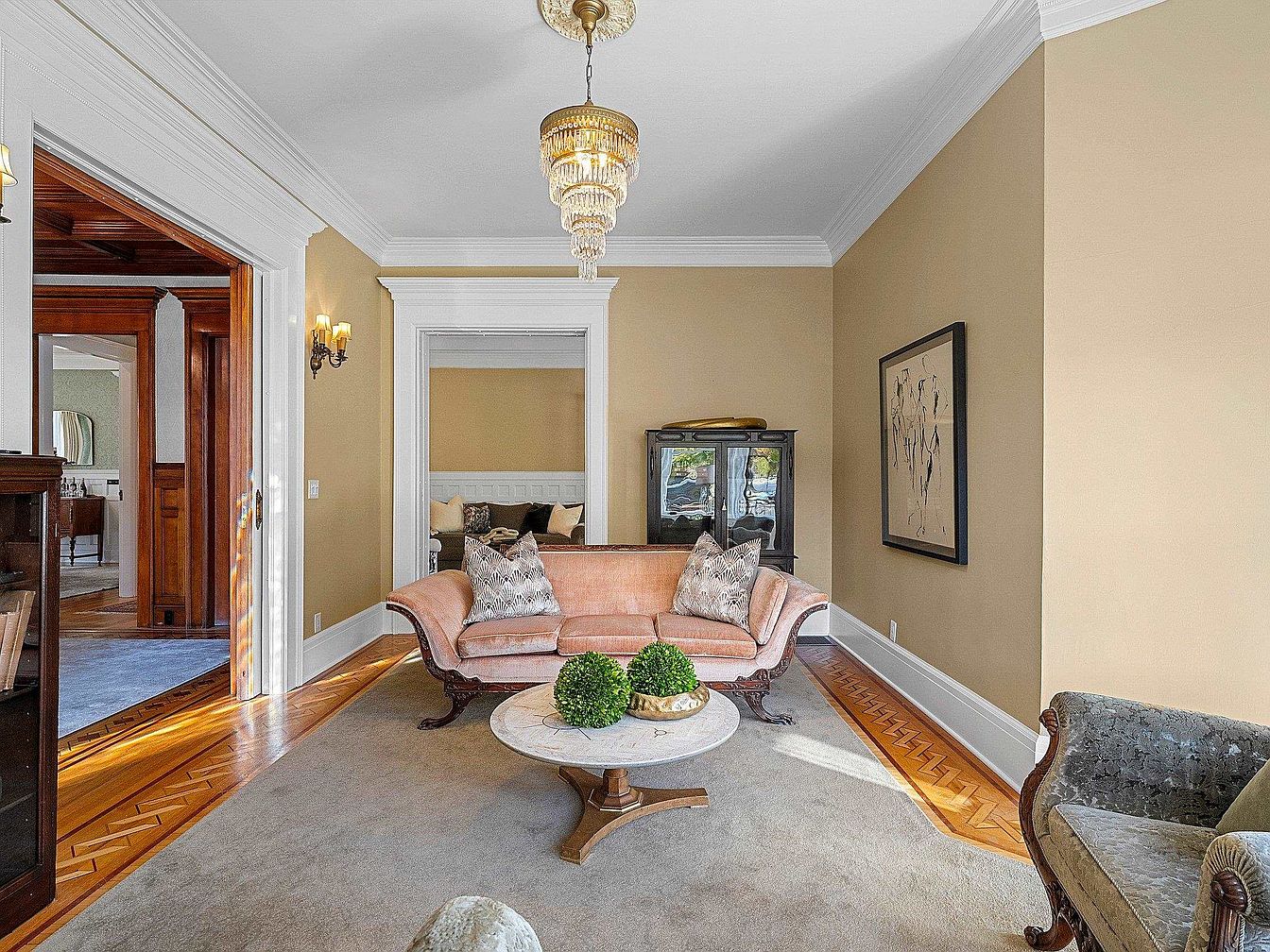 This inviting living room features a cozy seating area with an elegant, antique-style blush sofa and matching armchair, perfect for relaxing or entertaining guests. The warm beige walls complement intricate white crown molding and door frames, providing a classic, timeless backdrop. A round, marble-topped coffee table adorned with lush green topiary adds a touch of refreshing vibrance. The hardwood floors have distinct chevron patterned edging, offering family-friendly durability and charm. Soft, neutral carpeting ensures comfort for children at play. Large doorways enhance flow between rooms, and a statement chandelier and wall sconces provide sophisticated lighting, creating a welcoming and refined ambiance.