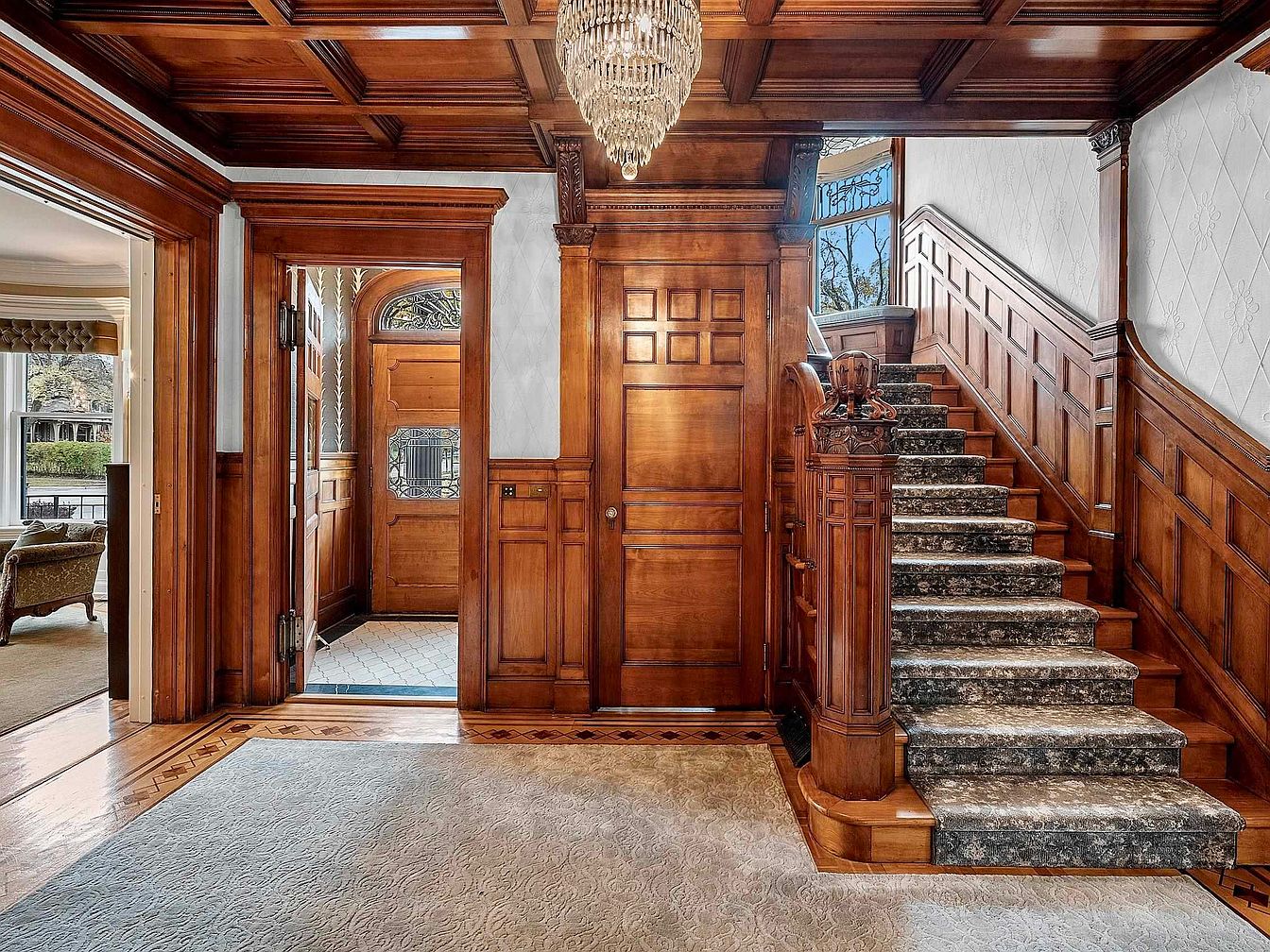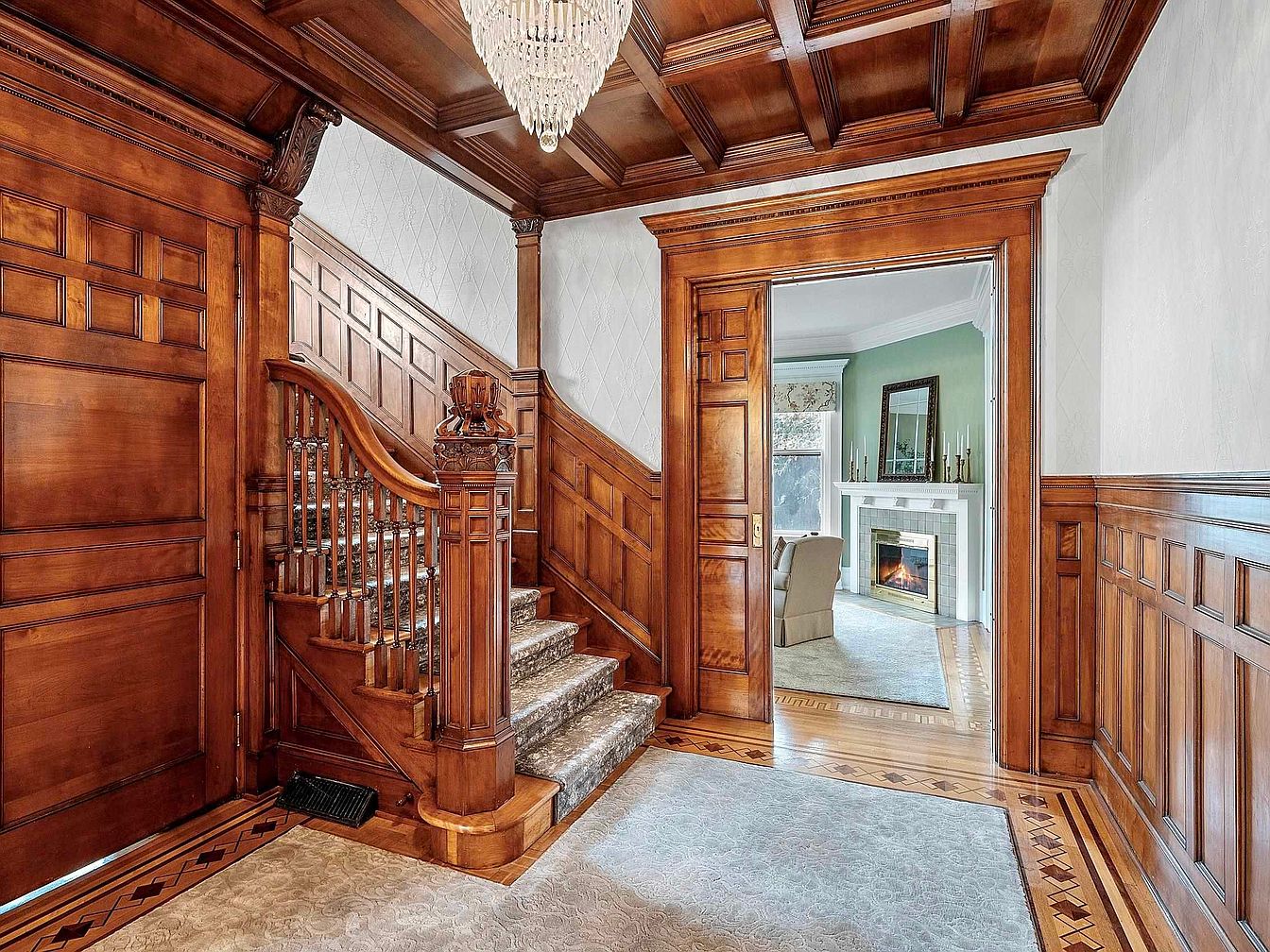 A stunning entryway welcomes guests with rich, intricate wood paneling and coffered ceiling, capturing classic American craftsmanship. The grand staircase boasts a plush runner and decorative balustrade, highlighting luxury and durability for active families. Natural wood tones dominate the palette, complemented by soft cream wallpaper for a bright and inviting look. Open sightlines lead into a cozy living room with a fireplace, inviting gatherings and family moments. Elegant details, including a sparkling chandelier and parquet flooring, infuse sophistication while the spacious layout allows for easy movement, perfectly blending timeless beauty with everyday functionality.