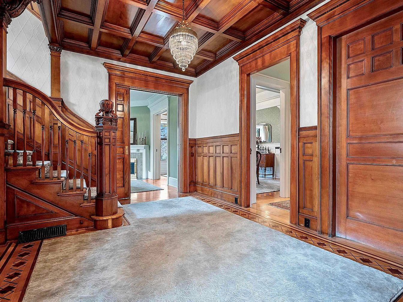 A spacious and inviting foyer welcomes guests with exquisite wood paneling and intricate coffered ceilings, exuding timeless elegance. The central staircase, adorned with a patterned runner, gracefully curves upward, while a stunning chandelier provides a focal point of classic luxury. Large windows and doorways allow natural light to flood the area, highlighting the warm tones of the wooden architecture. Comfortable access to adjacent living spaces ensures family-friendly flow. Plush carpeting and original architectural details make this entrance both practical for daily use and impressive for gatherings, setting an inviting tone for the rest of the home.