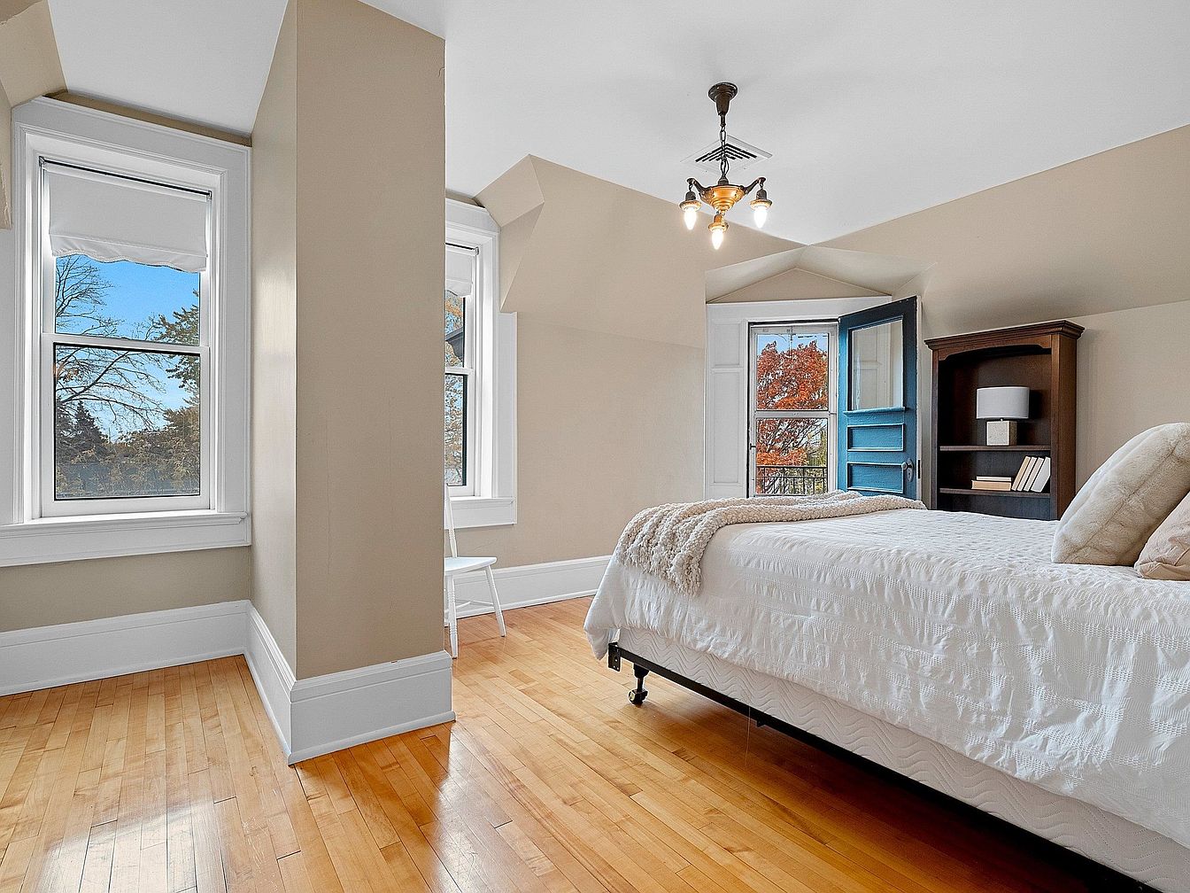This airy bedroom features a spacious layout defined by a charming architectural pillar that separates the bed from the sunlit nook by the windows, perfect for a reading or study corner. Large windows fill the room with natural light and offer scenic views, making it ideal for family living. The warm hardwood floors complement the soft beige walls and crisp white trim, creating a welcoming environment. A cozy bed with textured white linens and neutral pillows sits opposite a dark-wood bookshelf. The blue-painted door adds a pop of character, enhancing the blend of classic and modern aesthetics in this restful space.