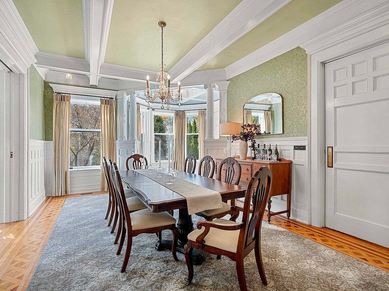 A spacious formal dining room showcases traditional elegance with rich wood furniture, including a long dining table surrounded by ornate chairs, ideal for family gatherings or entertaining guests. Soft green damask wallpaper and creamy wainscoting create a soothing color palette, while large bay windows invite natural light and highlight classic architectural details like coffered ceilings and crown molding. A crystal chandelier adds a touch of sophistication above the table, and the hardwood floor is framed with decorative inlay. Built-in cabinetry and a side buffet provide ample storage, making the space both beautiful and functional for family meals and celebrations.