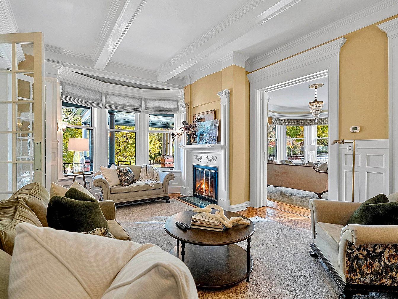 Warmth and comfort define this inviting living room, enhanced by expansive bay windows that fill the space with natural light. Classic architectural elements like crown molding, wainscoting, and coffered ceilings complement the soft cream and muted gold walls, creating an elegant backdrop. Plush sofas and armchairs with an array of cozy pillows surround a round coffee table, ideal for family gatherings or quiet reading time. The focal point is a beautifully detailed fireplace framed by built-in shelving and tasteful artwork. The open flow into the adjacent sitting room ensures family-friendly connectivity, perfect for both entertaining and daily living.