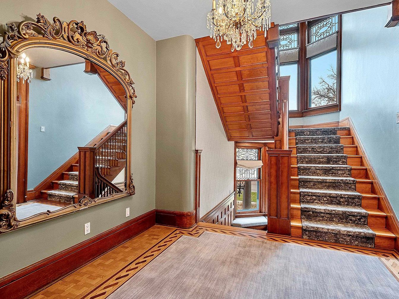 An elegant entryway features a beautifully detailed wooden staircase, accented with a plush patterned runner for comfort and safety, making it ideal for families. A massive, ornate mirror framed in gold adds both luxury and depth, reflecting sunlight from large bay windows that illuminate the space. The floor boasts intricate wood inlay bordering a soft, spacious area rug, perfect for welcoming guests or kids to sit and play. Rich wood trim and banisters showcase classic craftsmanship, while a sparkling chandelier overhead brings a touch of glamour and warmth, tying together the timeless, inviting aesthetic of this grand entrance.