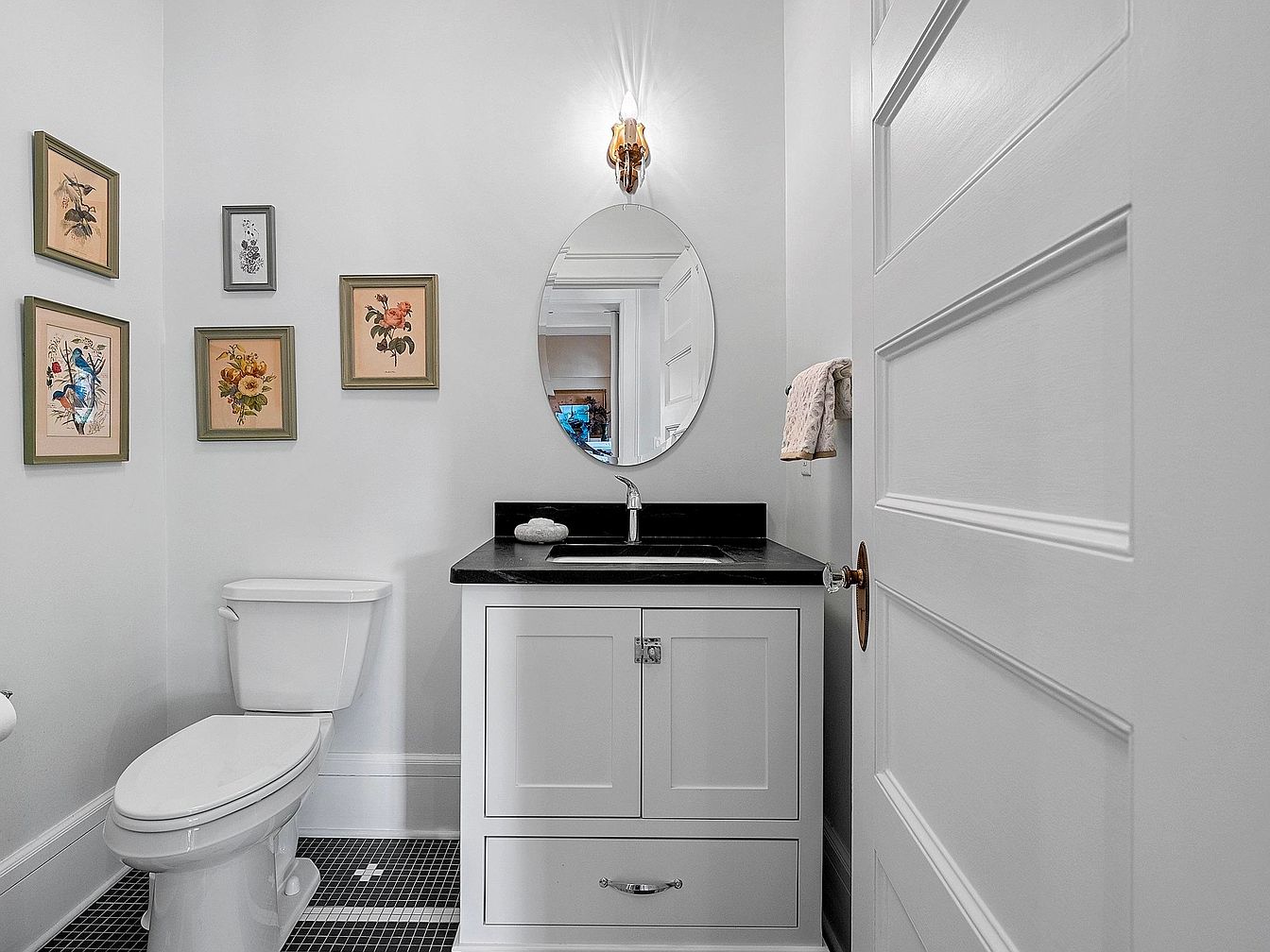 A charming powder room with a clean, bright aesthetic featuring soft white walls and a classic black-and-white mosaic tile floor. A white vanity with simple shaker-style cabinetry supports a sleek black countertop and an oval mirror, while a single brass sconce provides an inviting glow. The toilet is tucked neatly beside the vanity, and the wall above is accented with a tasteful arrangement of botanical prints in earthy tones. Thoughtful touches such as a towel rack and understated hardware ensure this space feels both functional and family-friendly, perfect for guests or daily use.