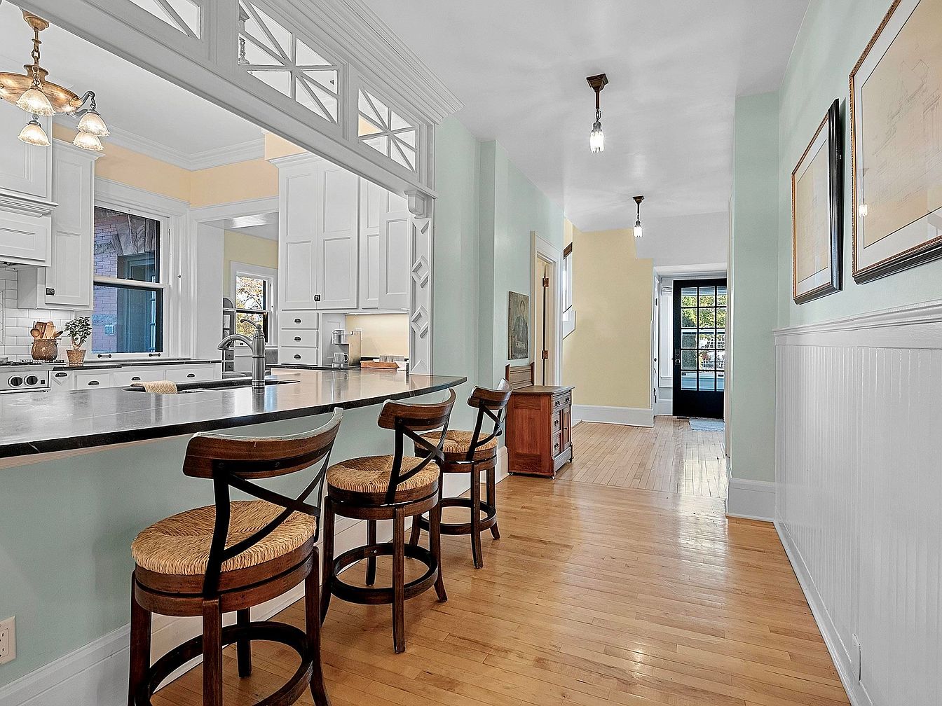 Warm hardwood floors stretch throughout this bright and inviting kitchen area, anchored by a spacious bar countertop with three charming wooden bar stools featuring woven seats. Crisp white cabinetry and a classic subway tile backsplash provide a timeless, clean aesthetic, while a decorative transom blends elegance with function above the counter. Subtle pastel walls enhance the airy mood, complemented by soft pendant lights and natural light flowing through large windows. The open layout connects seamlessly to a cheerful hallway, perfect for family movement. Framed artwork and beadboard paneling add character, making the space both stylish and welcoming for gatherings or daily routines.