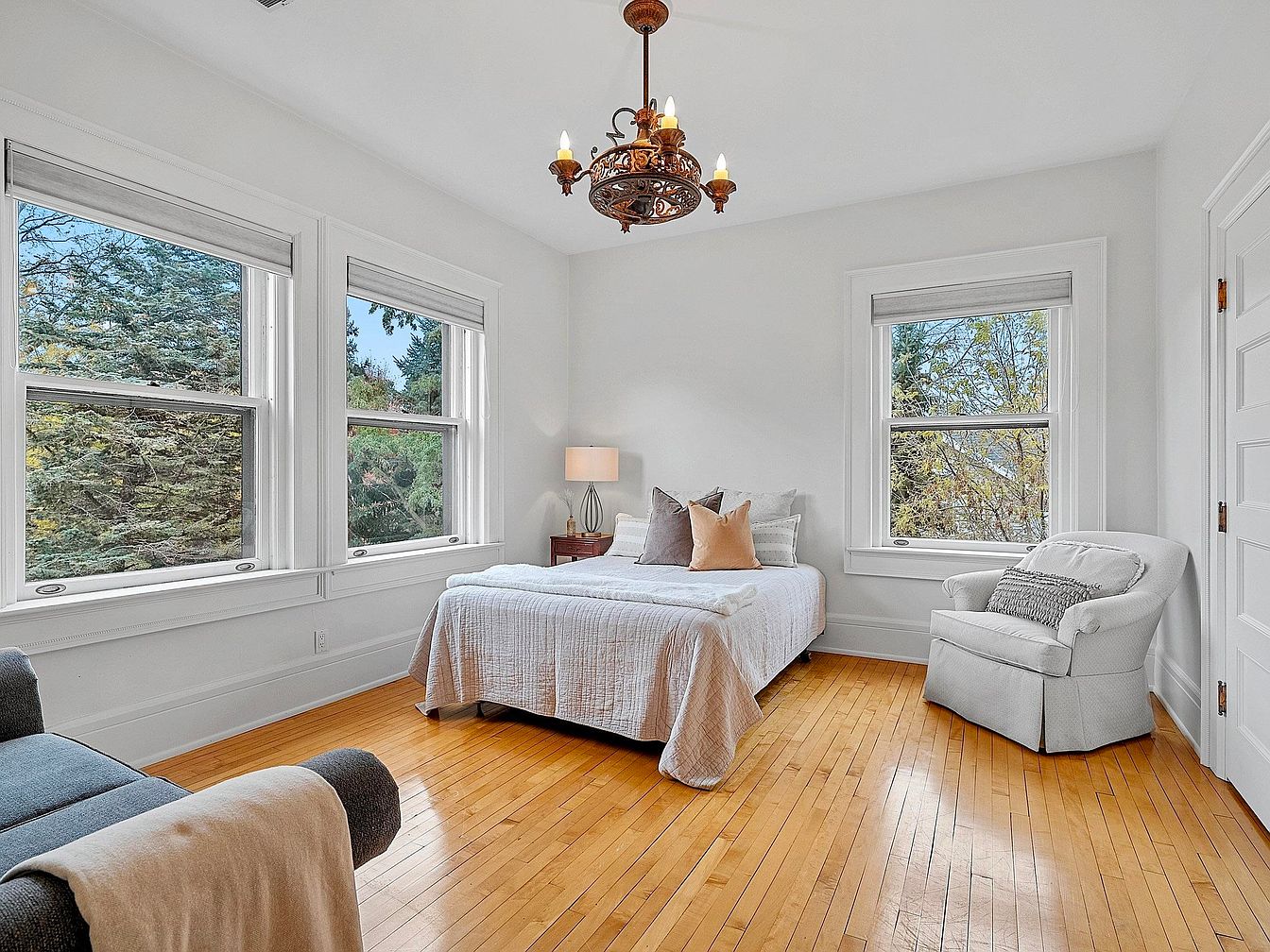 A welcoming bedroom featuring expansive windows that bathe the space in natural light and offer peaceful views of the surrounding trees, making it ideal for relaxation or quiet family time. The pale hardwood flooring complements the crisp white walls, enhancing the airy and open feel of the room. A cozy upholstered armchair sits in the corner, perfect for reading or comforting a child, while the neatly made bed is accented with plush pillows in soft neutral tones. Architectural details like wide window trims and a vintage-style chandelier add a classic touch, creating a serene and family-oriented atmosphere.