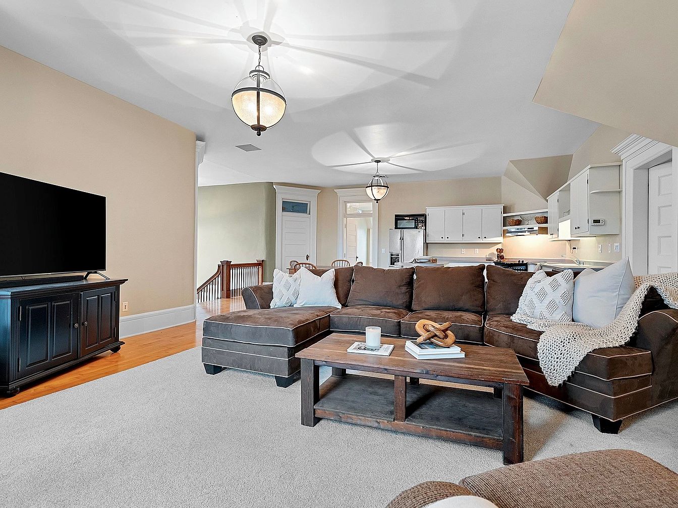 A spacious open concept living area seamlessly connects the living room and kitchen, ideal for family gatherings and entertaining. The room features a plush chocolate brown sectional sofa adorned with soft, patterned pillows and a knitted throw, inviting comfort and relaxation. A large wooden coffee table anchors the seating area, complemented by a sleek dark media console supporting a flat-screen TV. Creamy neutral walls and light carpeting create a warm, welcoming ambiance, while the kitchen in the background blends classic white cabinetry with modern stainless steel appliances. The space is illuminated by elegant pendant lighting, highlighting its contemporary yet homely charm.
