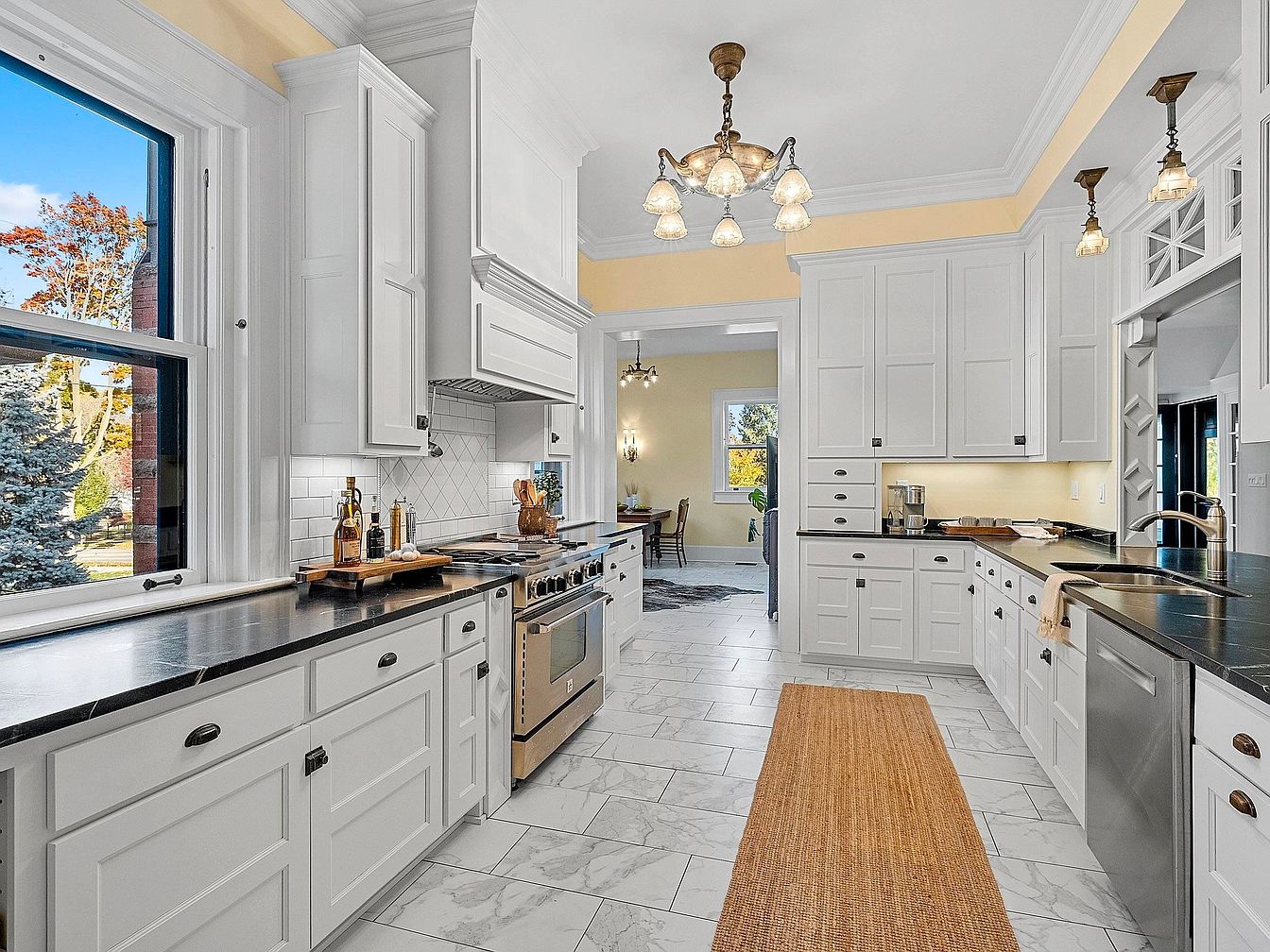 A bright, spacious kitchen featuring crisp white cabinetry with shaker-style doors and elegant black countertops that create a timeless and inviting atmosphere. Large windows let in abundant natural light, enhancing the cheerful soft yellow wall accents. Practical subway tile backsplash, a double farmhouse sink, high-end stainless steel appliances, and plenty of counter space offer ideal family-friendly features for meal prep and gatherings. Ornate lighting fixtures and crown molding add refined architectural detail, while the long woven runner grounds the marble-look tile floors. Functional layout with ample storage and open access to a cozy dining area makes this space perfect for everyday living.