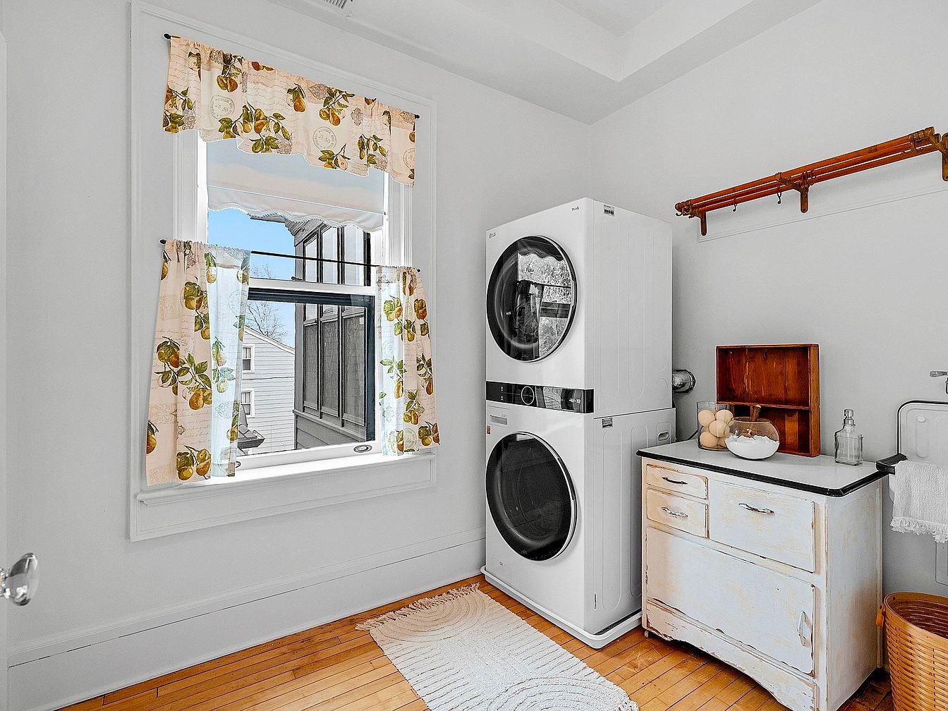 This laundry room blends vintage appeal with modern functionality, featuring a bright and airy space illuminated by natural light through large windows adorned with lemon-patterned curtains. The stacked washer and dryer maximize efficiency and floor space, making it family-friendly and practical for busy households. The rustic, distressed wood cabinet adds character while providing ample storage for essentials. A simple, white rug softens the hardwood floor, and a wooden wall rack offers additional hanging storage. The light color palette, including soft whites and gentle hints of yellow and green from the decor, creates a refreshing, welcoming atmosphere ideal for daily chores.