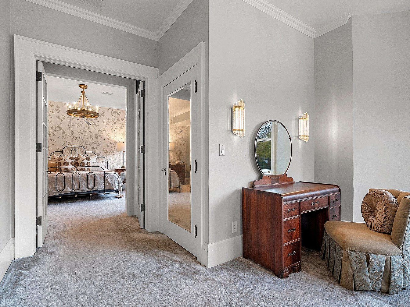 Soft, neutral tones create a soothing transition between spaces, with plush carpeting underfoot for comfort and warmth—ideal for families with children. An elegant vanity with an oval mirror sits along one wall, flanked by crystal wall sconces that add a touch of vintage glamour. Across the hall, double doors open into a bedroom featuring a wrought iron bed, patterned accent pillows, and floral wallpaper, contributing to a serene, inviting atmosphere. High baseboards, crown molding, and mirrored closet doors enhance the room’s classic architectural appeal, making the space both stylish and functional for everyday living.