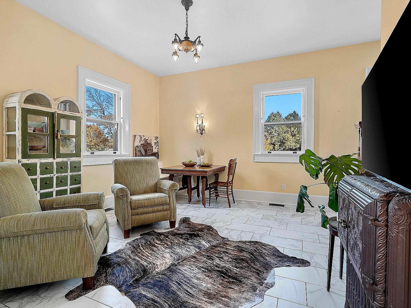 A welcoming sitting area filled with natural light from large windows overlooking greenery, making it perfect for family gatherings or quiet afternoons. Soft yellow walls give the room a warm, inviting ambiance, complemented by classic white trim. The furniture features two plush armchairs with subtle green upholstery arranged around a textured, dark cowhide rug that adds rustic charm. A farmhouse-style cabinet with distressed green-and-white finishes provides ample storage and a touch of vintage flair. A jute plant and decorative accents enhance the homely atmosphere, while the marble-tiled floor and ornate cast-iron heater add elegance and character to this multi-functional family space.