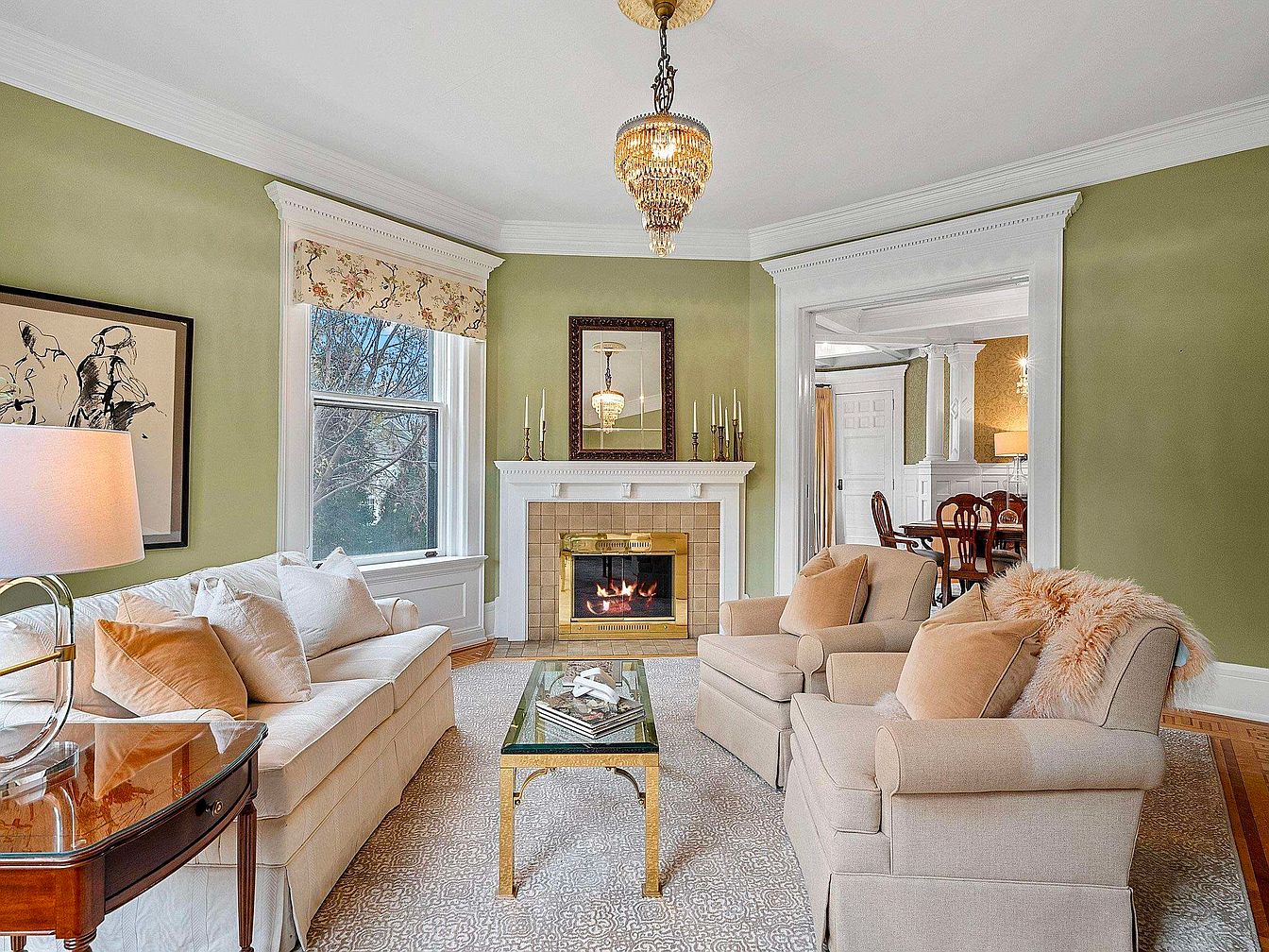 A welcoming living room designed for both relaxation and family gatherings features soft green walls and crisp white trim, creating a serene backdrop. The plush beige sofas and armchairs are arranged around a glass coffee table, encouraging conversation or cozy evenings by the elegant fireplace. Light from the chandelier sparkles above, complemented by natural sunlight pouring in through large windows with subtle floral shades. A framed sketch adds artistic flair, while the soft rug underfoot enhances comfort for children or adults alike. Thoughtful architectural details, including crown molding and wide doorways, add sophistication and support easy movement into the adjacent dining area.