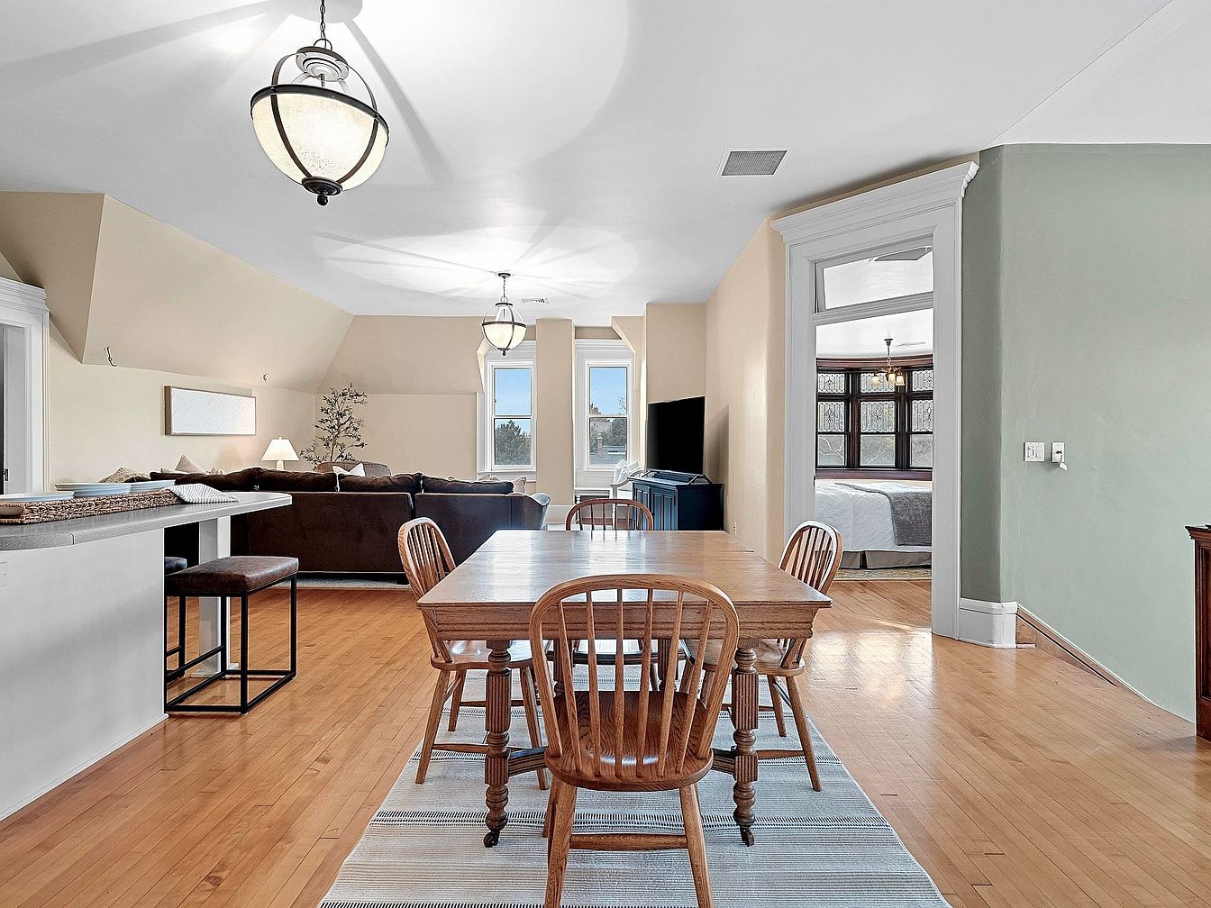 A spacious open-concept dining and living space welcomes natural light through large windows, creating a warm and inviting atmosphere perfect for families. The dining area features a classic wooden table with matching spindle-back chairs set atop a soft area rug, offering a cozy spot for shared meals or homework time. Light hardwood floors flow throughout, enhancing the airy feel. The living room hosts a plush sectional centered around accent lighting, while a breakfast bar with high stools bridges the kitchen to the dining area for casual gatherings. A calming combination of neutral beige walls and soft green accents adds timeless character.