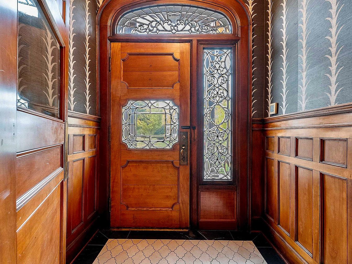 This entryway showcases classic American home elegance with rich, medium-toned wood paneling enveloping the space and adding warmth and sophistication. The substantial wooden front door is adorned with decorative beveled glass panels, allowing natural light to gently filter through while maintaining privacy. Intricate ironwork within the glass panels introduces artisanal flair and character. Stylish wallpaper above the wainscoting features a chic, neutral pattern that brings texture and visual interest to the walls. The tiled flooring provides lasting durability and easy maintenance, making it practical for families and welcoming for guests. The design offers a refined and inviting first impression.