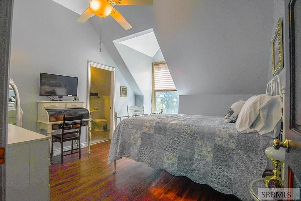 This inviting bedroom features a charming combination of cozy functionality and classic comfort, ideal for family living. Soft gray walls and vaulted ceilings create a calming, airy atmosphere, while polished wooden floors add warmth. A large window with a contemporary shade allows abundant natural light and frames a beautiful outdoor view. The bed is accented by an elegant, light quilt, and decorative pillows offer extra comfort. Functional family-friendly features include a dedicated workspace with a roll-top desk, a wall-mounted TV, and direct access to a private ensuite bathroom. Touches of personality appear in framed art and an antique-style mirror.
