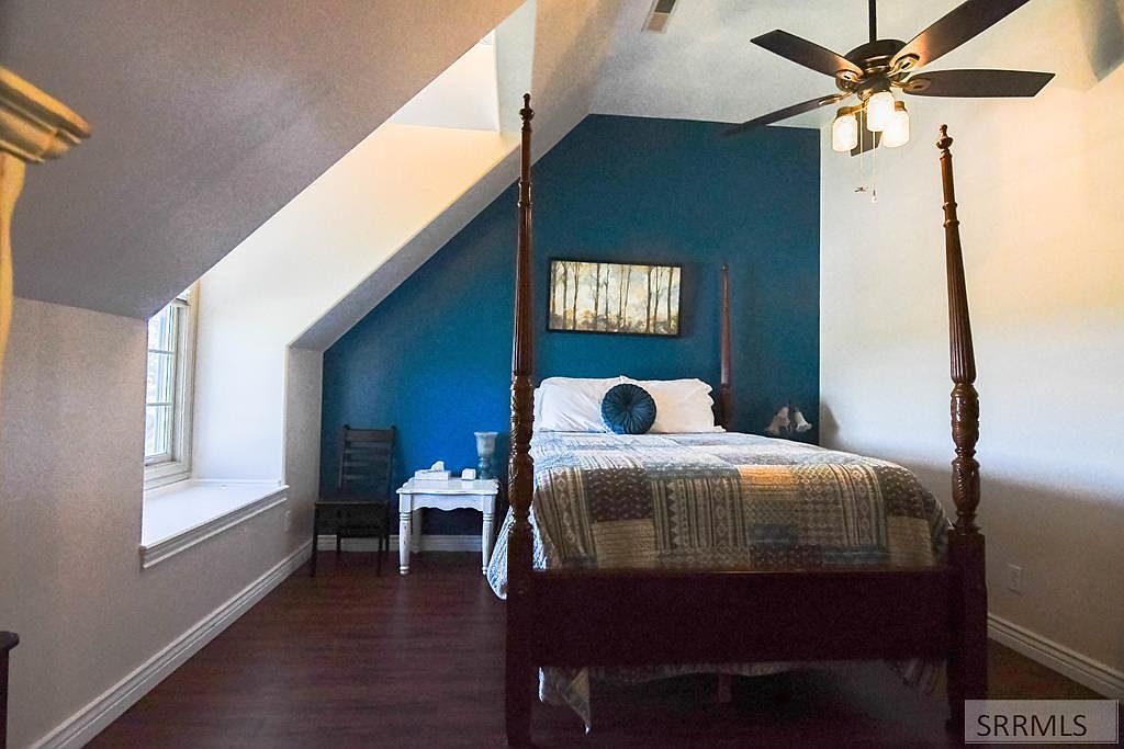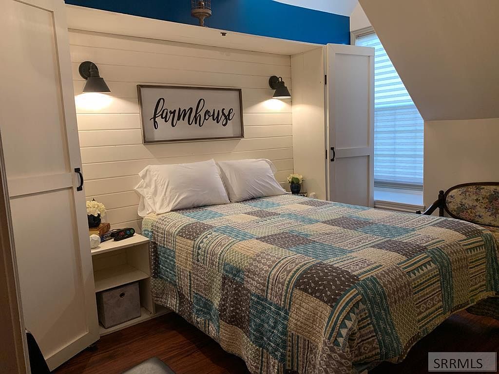 A charming bedroom nestled beneath a sloped ceiling, this inviting space highlights architectural angles that create a sense of coziness and privacy. A deep blue accent wall serves as a dramatic backdrop for the stately four-poster bed, which is dressed in a patchwork quilt and plush pillows. The polished hardwood floors add warmth, while a classic window seat offers the perfect reading spot flooded with natural light. A white nightstand, black accent chair, and subtle landscape artwork enhance the welcoming ambiance. Family-friendly and peaceful, this bedroom is ideal for restful nights or quiet moments to unwind.