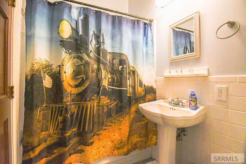 A charming bathroom featuring a unique train-themed shower curtain that adds playful character, making it especially appealing for families with children. The layout is compact yet functional, with a classic pedestal sink and white tile wainscoting along the walls for a clean and timeless look. Soft blue-gray painted walls create a calming atmosphere, complemented by a framed mirror and polished chrome fixtures. Ample lighting above the mirror provides a bright and welcoming feel, while the accessible towel ring and conveniently placed light switch ensure comfort and ease of use for all ages. This inviting space blends fun and practicality effortlessly.