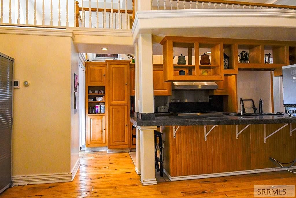 A warm, inviting kitchen features natural wood cabinetry and a central breakfast bar with sturdy supports and a sleek, dark countertop. The open shelving above the stovetop adds charm and functionality, displaying colorful pottery and decorative items. Light hardwood floors enhance the cozy, family-friendly atmosphere, while the high ceilings and upper banister offer architectural interest and a sense of spaciousness. The thoughtful layout includes ample pantry storage and modern appliances, making it practical for daily family life. Soft, neutral wall colors further brighten the space, creating a welcoming environment for gatherings and everyday meals.