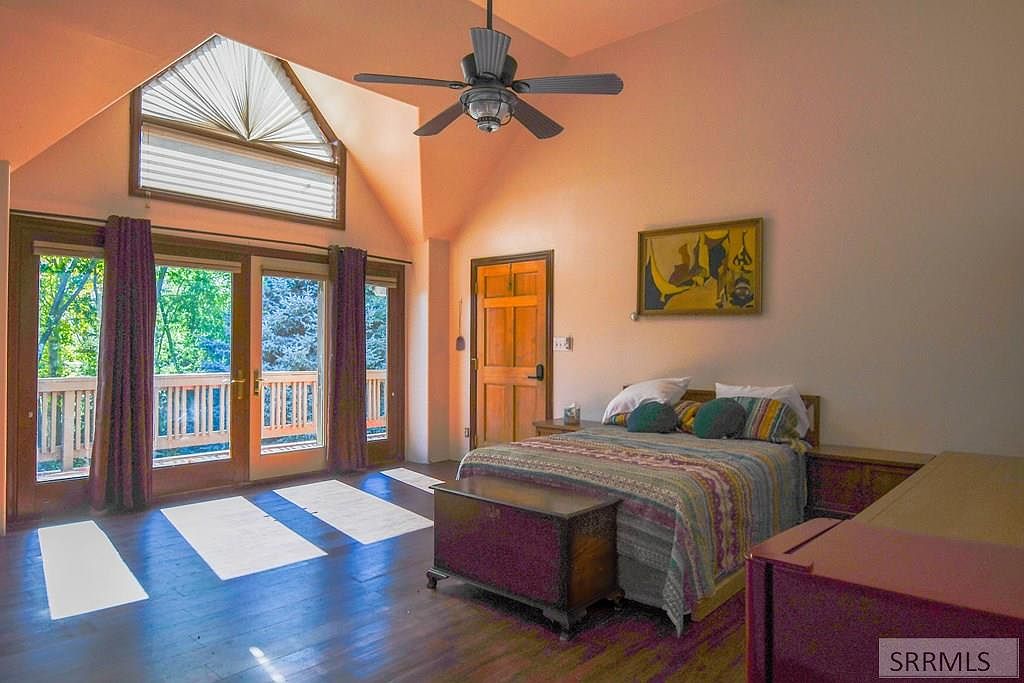 A spacious master bedroom features lofty vaulted ceilings and an abundance of natural light streaming through expansive glass doors, which open onto a private balcony surrounded by lush greenery. The room is designed for relaxation and family comfort, with warm peach-tinted walls, rich wooden trim, and dark hardwood flooring creating a cozy atmosphere. A large bed with a colorful, textured quilt is complemented by plush accent pillows and practical, sturdy wood furniture. Thoughtful touches such as stylish curtains, a modern ceiling fan, and a vibrant abstract painting enhance the room’s welcoming, personal feel, making it ideal for peaceful rest and quality family time.