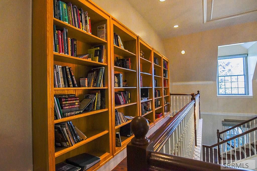 A cozy upstairs landing features built-in wooden bookshelves filled with a colorful assortment of novels and reference books, perfect for curious minds of all ages. The shelves add warmth and character, inviting family members to pause and find their next favorite read. Recessed ceiling lights cast a gentle glow, making this spot ideal for quiet study or relaxing with a good book. A sturdy bannister with traditional spindles offers safety for children and easy access from the staircase. The neutral walls and natural light pouring in from the window create a bright and welcoming atmosphere for families to enjoy together.