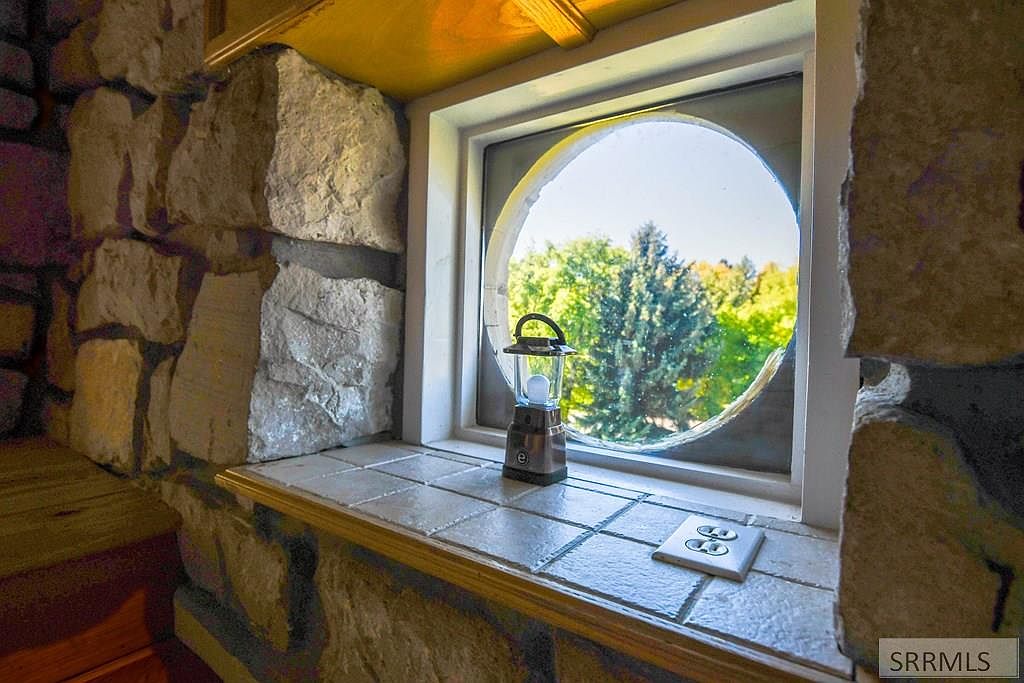 A cozy stone window nook offers a charming view of lush greenery outside, framed by a unique circular window that infuses the space with natural light. The thick stone walls and tiled window ledge lend a rustic, castle-like character, making this corner a welcoming retreat for reading or play. Warm wood accents are visible above, balancing the cool stone textures. An electric outlet and a small lantern lamp add practical comfort, perfect for families needing a quiet spot or a display area for favorite keepsakes. The soft, neutral hues complement the organic ambiance, creating a serene, family-friendly hideaway.