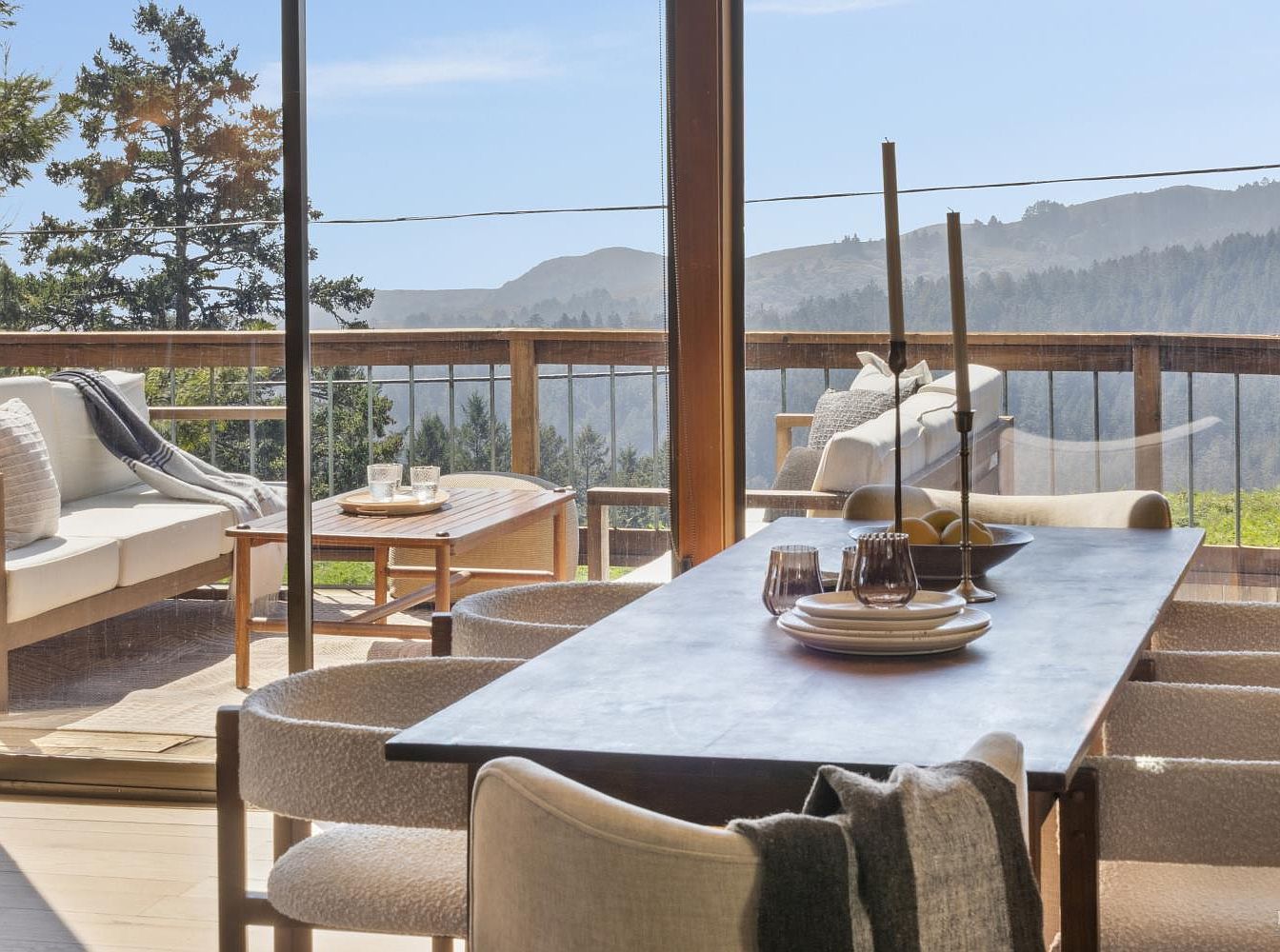 A spacious and light-filled dining area flows seamlessly onto a wooden deck, offering sweeping views of forested hills and distant mountains. The interior features a sleek dining table set with modern glassware, understated neutral plates, and elegant candleholders, surrounded by plush, boucle-upholstered chairs for comfortable family gatherings. Floor-to-ceiling glass doors invite natural sunlight, while the soft, neutral color palette creates a calming atmosphere. Outside, cozy patio sofas with textured pillows and throws provide inviting spots for relaxation, making this space ideal for both everyday living and entertaining in a family-friendly indoor-outdoor setting.