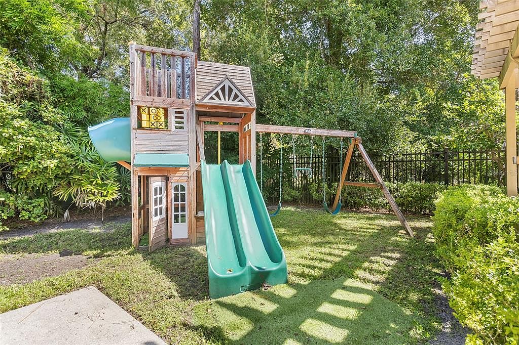 This inviting backyard playground blends seamlessly into the outdoor space, featuring a wooden playset designed for active imagination and creativity. With a charming dual-slide setup and a shaded fort for quiet play, the structure promotes family bonding and outdoor activity. The vibrant green shade of the slides contrasts beautifully with the natural wood finish, creating an appealing aesthetic. Surrounding the play area, lush greenery and manicured hedges provide a serene backdrop and safe environment. A swing set is nearby, offering additional entertainment and inviting children to enjoy hours of fun. This thoughtfully designed play zone is perfect for fostering active lifestyles.