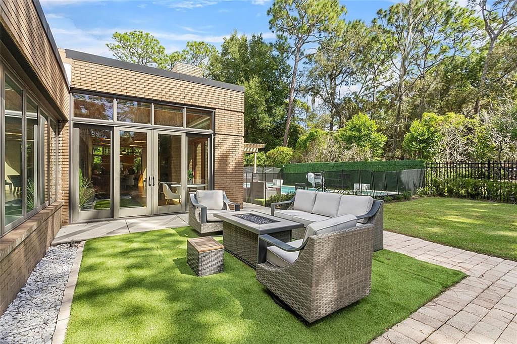 This inviting outdoor living area seamlessly blends comfort with nature, featuring a stylish arrangement of modern wicker seating around a central fire pit. The well-maintained artificial turf provides a lush, green backdrop, enhancing the serene ambiance. Large glass doors grant easy access to the interior, creating a harmonious flow between indoor and outdoor spaces. The gentle pops of greenery from surrounding trees add privacy and tranquility, while the sleek furniture exudes a contemporary flair. Perfect for families, this space encourages outdoor gatherings, relaxation, and recreation in a beautifully landscaped environment that complements the architectural design.