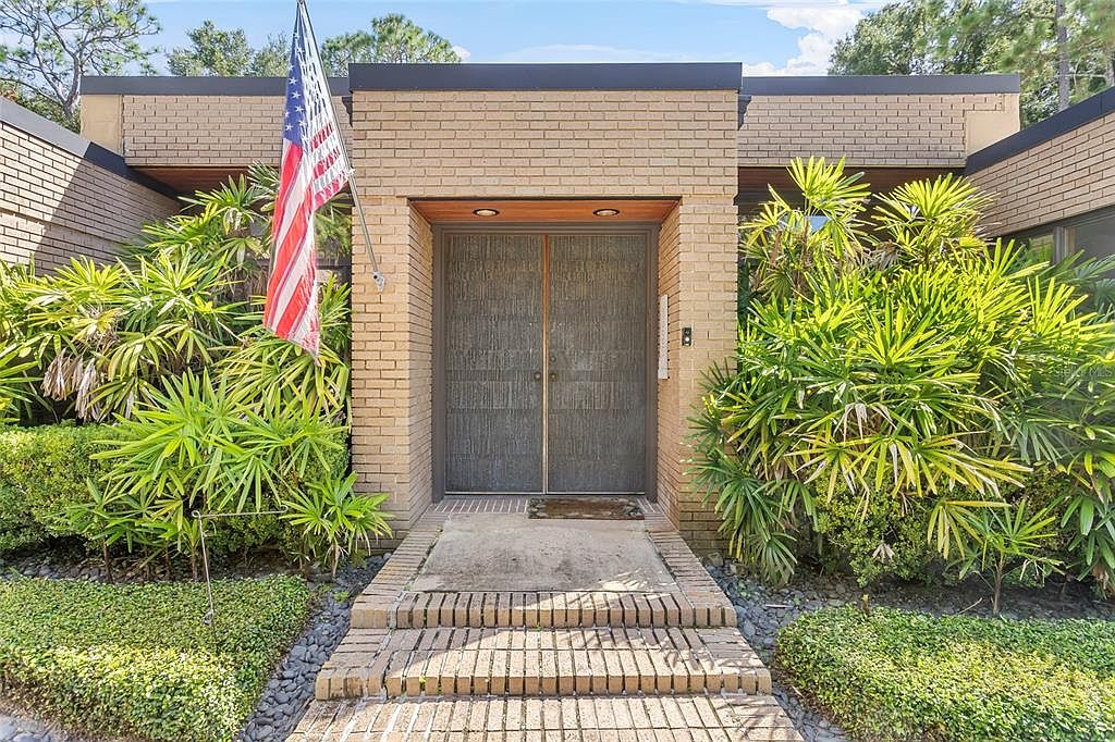 The front entrance features a striking combination of modernist elements and natural landscaping. The textured brick facade creates a warm and inviting atmosphere, while the sleek, minimalist door adds a contemporary touch. Framed by lush greenery, including vibrant palm-like plants, the entryway exudes a sense of tranquility and harmony with nature. A welcoming flag adds a classic American charm, enhancing the home’s appeal. The stone pathway leads visitors to the entrance, making it family-friendly and easily accessible. The thoughtfully designed layout ensures a seamless transition from the outdoors to the inviting interior spaces.