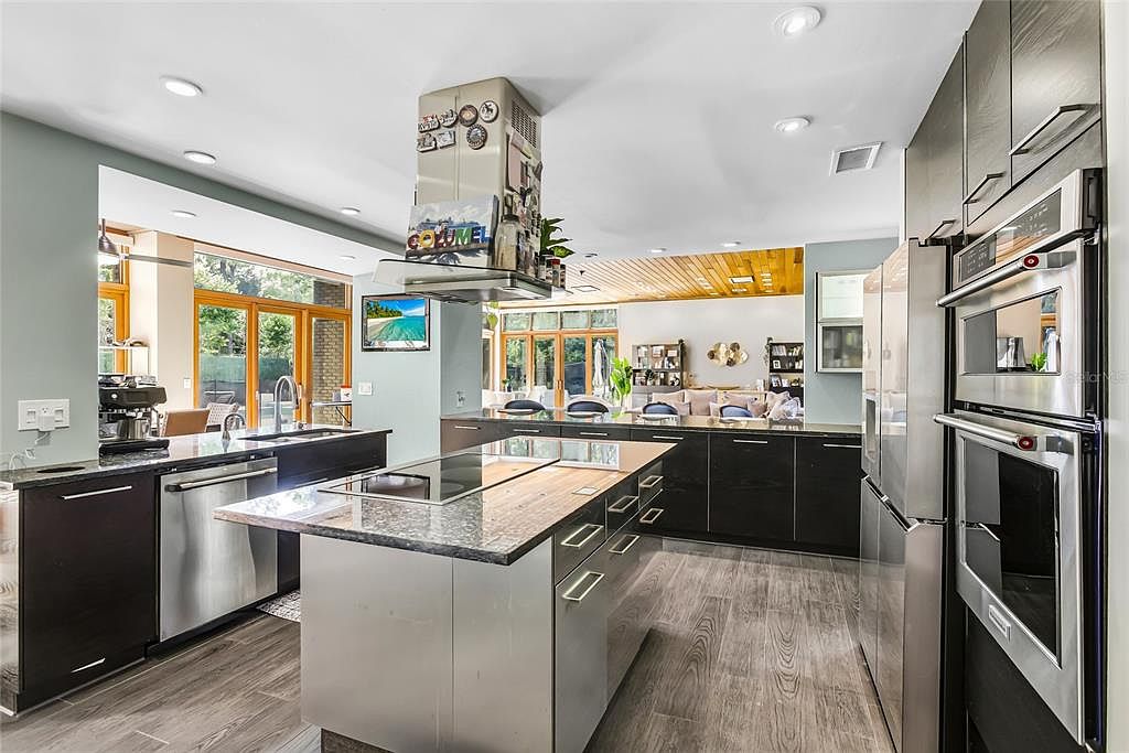 This contemporary kitchen features an open layout that seamlessly connects to a dining area, perfect for family gatherings. Sleek stainless steel appliances enhance functionality, while the large island serves as a central hub for cooking and casual dining. Dark wood cabinets contrast beautifully with light countertops, creating a chic color palette. The unique design includes a custom glass sliding door that adds character and transparency, showcasing an inviting ambiance. Warm wood accents on the ceiling and a polished floor offer a touch of elegance, ensuring this space is both stylish and welcoming for everyday activities.