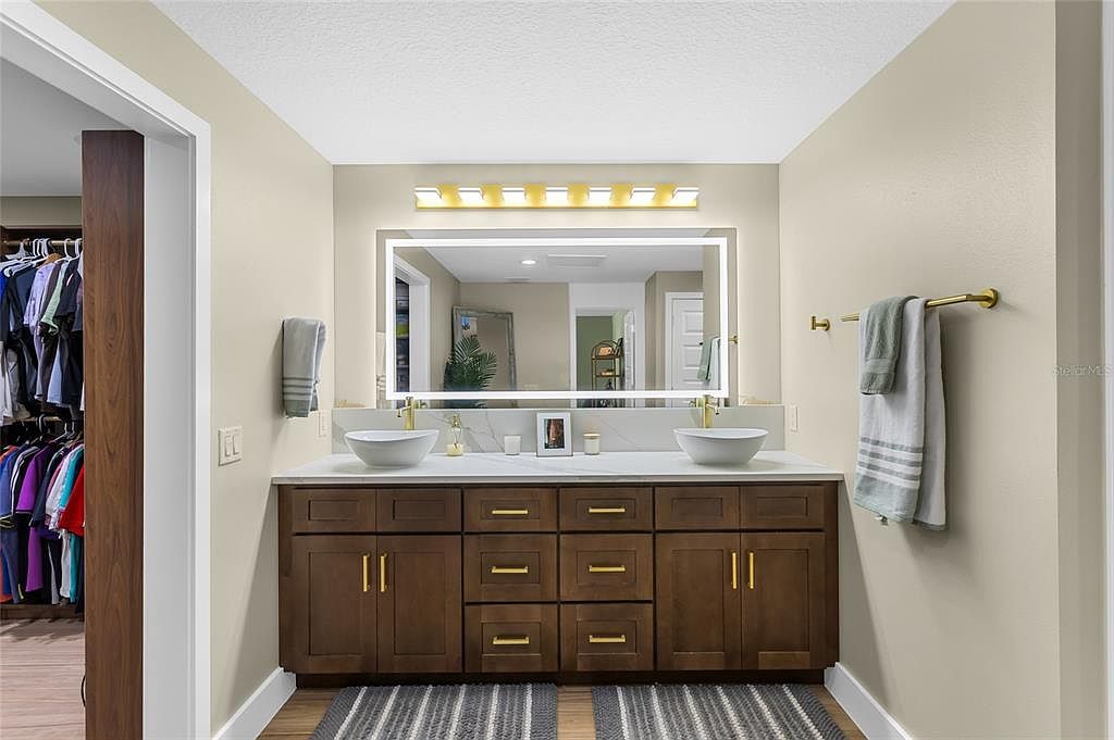 This master bathroom seamlessly blends modern aesthetics with functional design. A double vanity features rich brown cabinetry complemented by sleek gold hardware, offering ample storage for daily essentials. The white vessel sinks sit elegantly atop a pristine countertop, while a large illuminated mirror enhances the space, creating an inviting feel. Soft beige walls and warm wood flooring infuse a cozy atmosphere, making it perfect for family use. Thoughtful lighting above the mirror adds brightness, while plush towels neatly hung on a gold rack add a touch of luxury. A stylish rug adds texture and comfort underfoot.